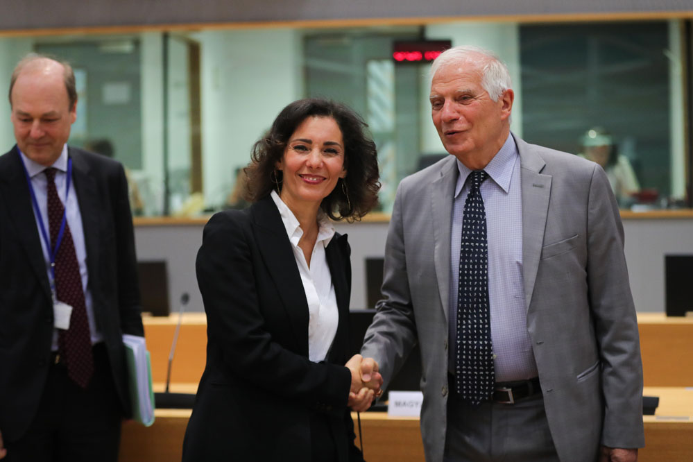7月18日,在比利時布魯塞爾,歐盟外交與安全政策高級代表博雷利(右)與比利時外交大臣拉比卜在會前握手。