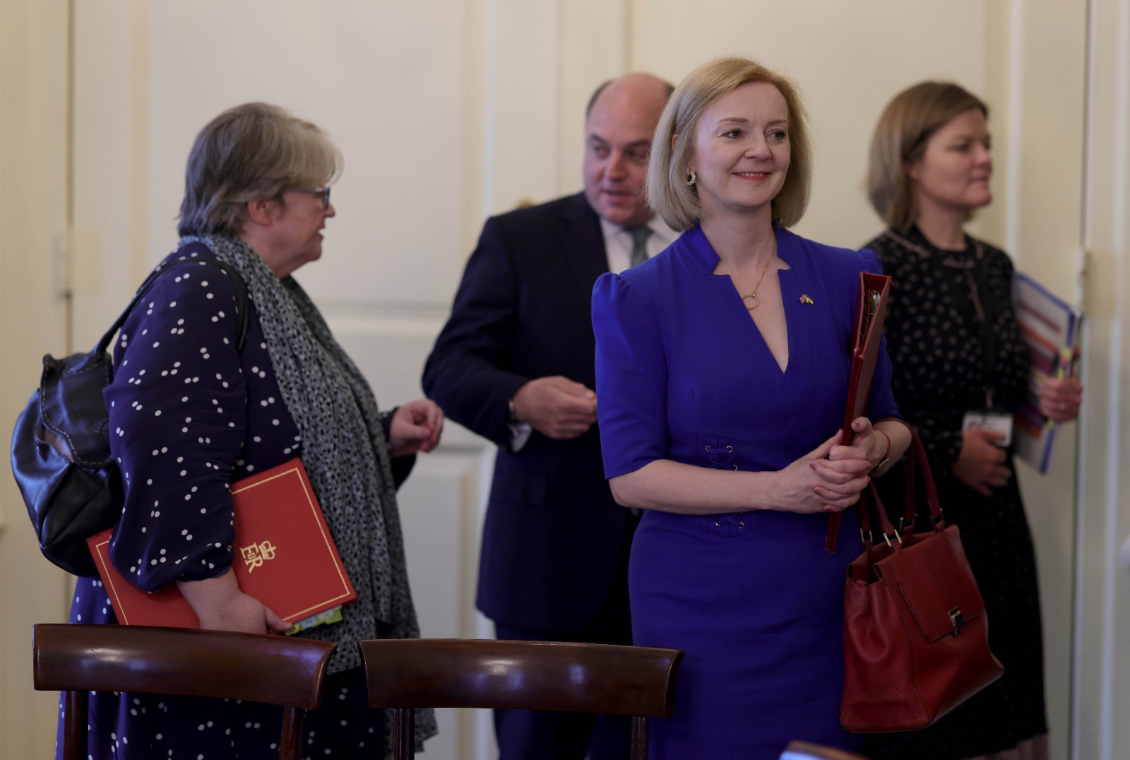 這是伊麗莎白·特拉斯(右二)在英國(guó)倫敦首相府參加內(nèi)閣會(huì)議后離開的資料照片(7月12日攝)。