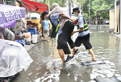 7月22日,河南省鄭州市突降暴雨,市區(qū)部分低洼區(qū)域形成積水,給群眾生活造成不便。鄭州市公安局民警輔警走上街頭服務(wù)群眾。