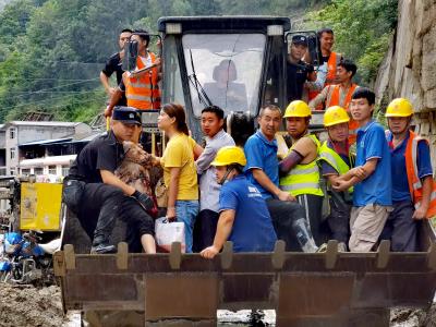 圖為綿陽市公安局特巡警支隊(duì)特警大隊(duì)民警和其他救援人員一起乘坐推土機(jī)前往災(zāi)情嚴(yán)重地點(diǎn)救援群眾。