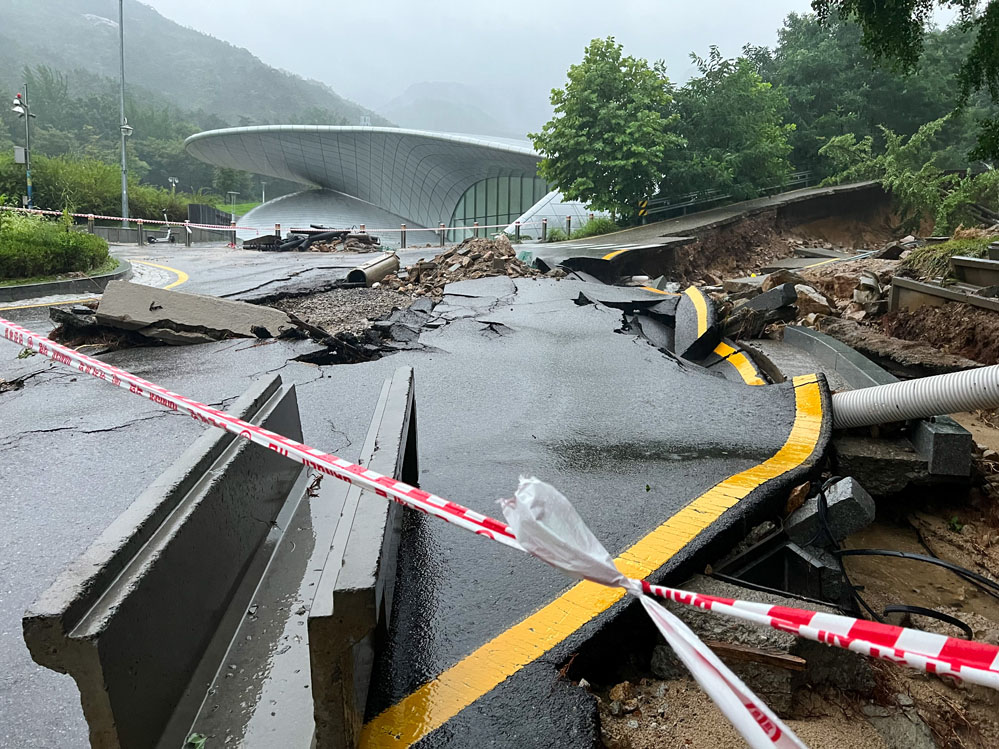 這是8月9日在韓國(guó)首爾大學(xué)拍攝的因遭遇強(qiáng)降雨而受損的道路(手機(jī)拍攝)。