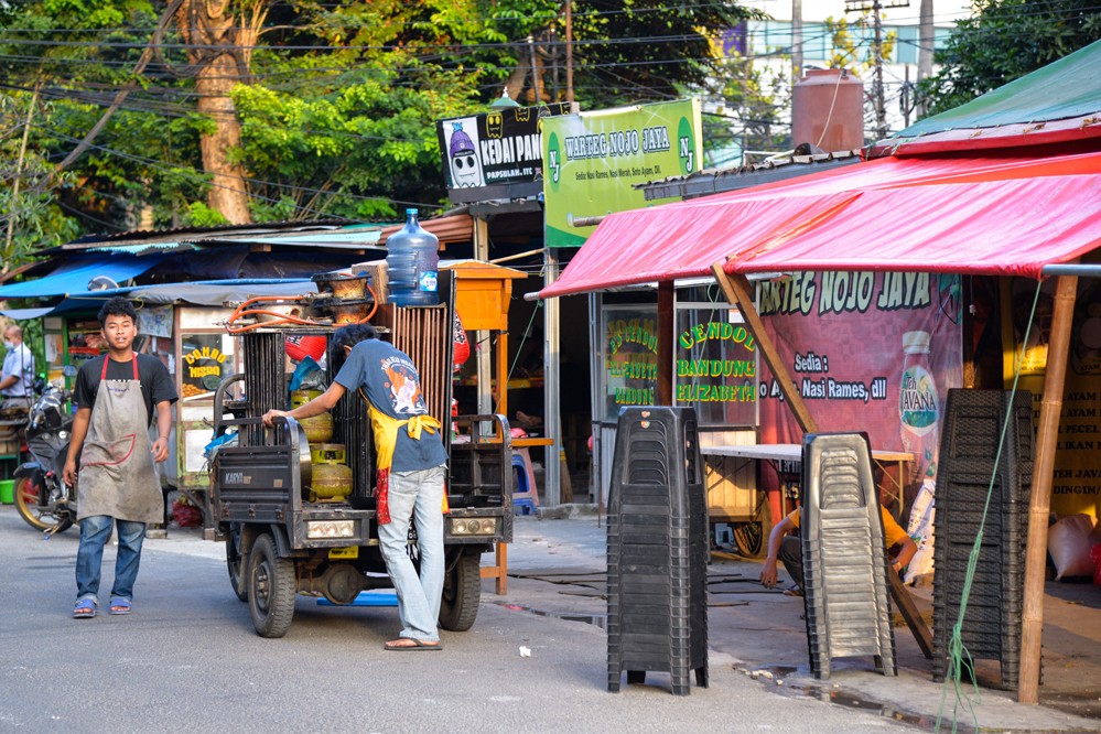 8月1日,商販在印度尼西亞首都雅加達(dá)街頭搭建臨時(shí)攤位。