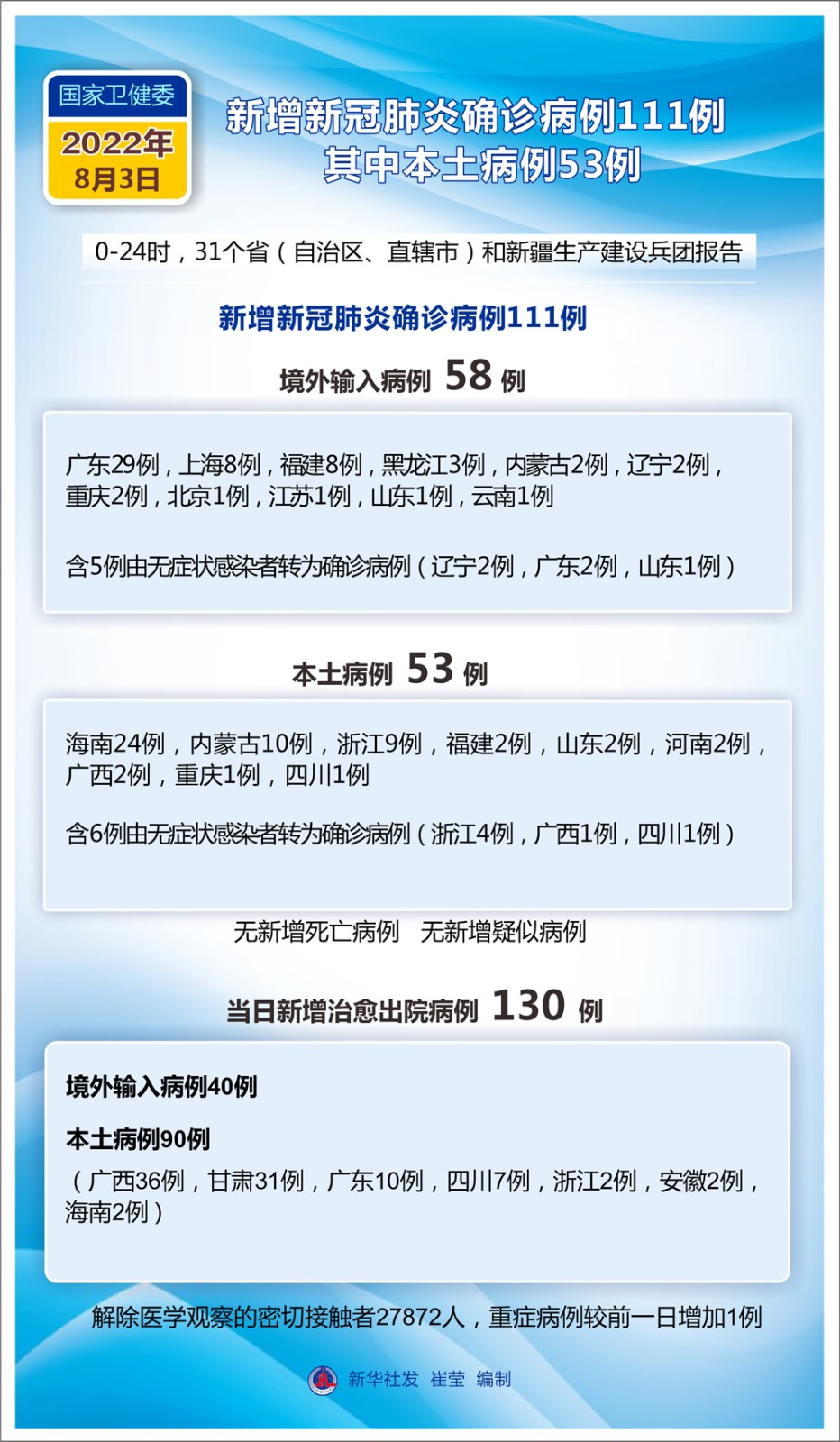 (圖表)國(guó)家衛(wèi)健委:8月3日新增新冠肺炎確診病例111例 其中本土病例53例