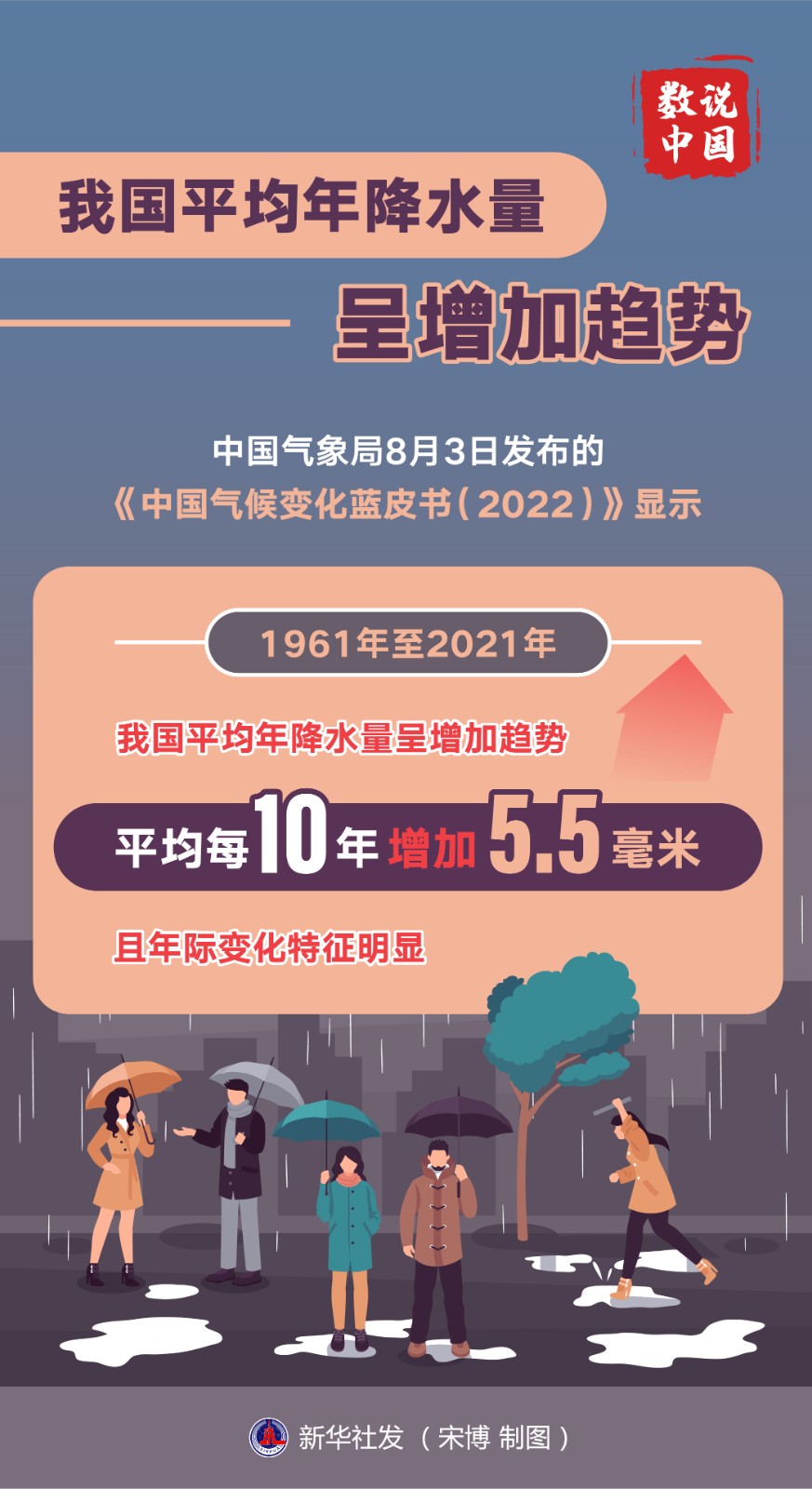 中國氣象局8月3日發(fā)布的《中國氣候變化藍皮書(2022)》顯示,1961年至2021年,我國平均年降水量呈增加趨勢,平均每10年增加5.5毫米,且年際變化特征明顯。