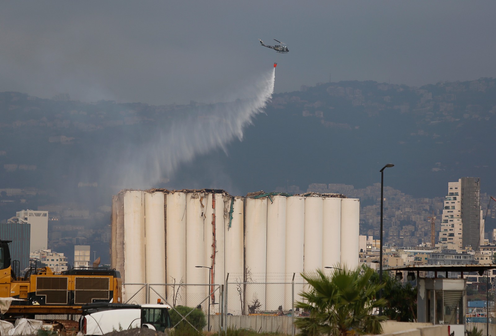 7月31日,在黎巴嫩貝魯特港口,直升機(jī)向部分坍塌的港口糧倉(cāng)灑水。