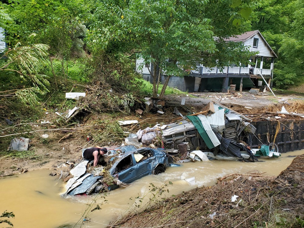 這是7月30日在美國肯塔基州東部阿巴拉契亞山區(qū)拍攝的受損的汽車與房屋。