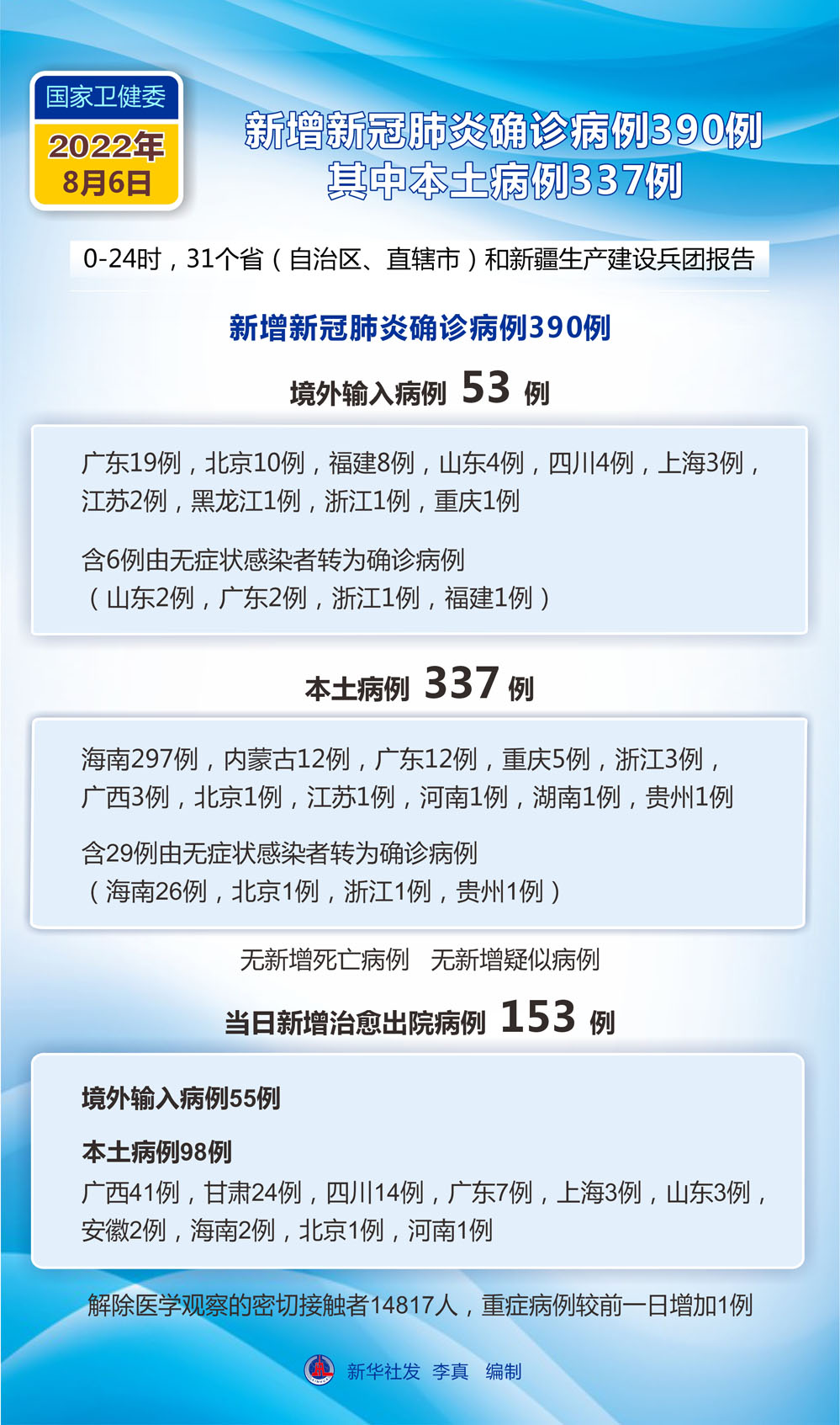 (圖表)國(guó)家衛(wèi)健委:8月6日新增新冠肺炎確診病例390例 其中本土病例337例