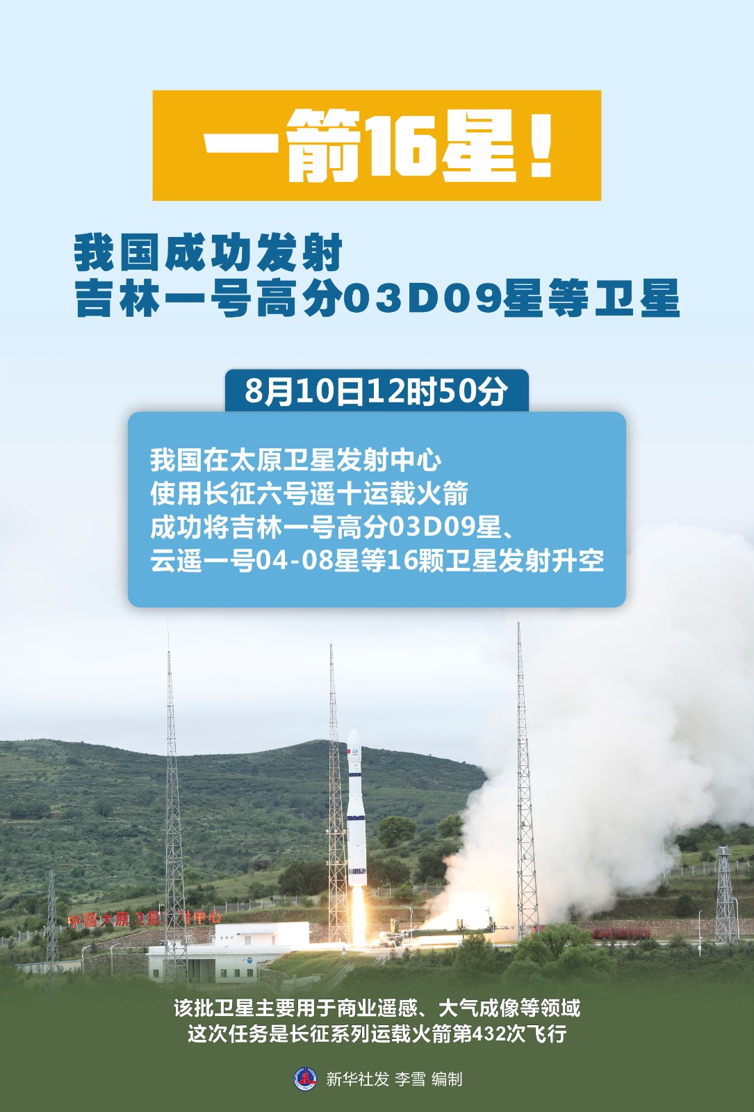8月10日12時50分,我國在太原衛(wèi)星發(fā)射中心使用長征六號遙十運(yùn)載火箭,成功將吉林一號高分03D09星、云遙一號04-08星等16顆衛(wèi)星發(fā)射升空,衛(wèi)星順利進(jìn)入預(yù)定軌道,發(fā)射任務(wù)獲得圓滿成功。