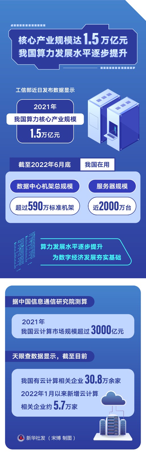 工信部近日發(fā)布數(shù)據(jù)顯示,2021年,我國(guó)算力核心產(chǎn)業(yè)規(guī)模達(dá)1.5萬億元。截至2022年6月底,我國(guó)在用數(shù)據(jù)中心機(jī)架總規(guī)模超過590萬標(biāo)準(zhǔn)機(jī)架,服務(wù)器規(guī)模近2000萬臺(tái)。算力發(fā)展水平逐步提升,為數(shù)字經(jīng)濟(jì)發(fā)展夯實(shí)基礎(chǔ)。