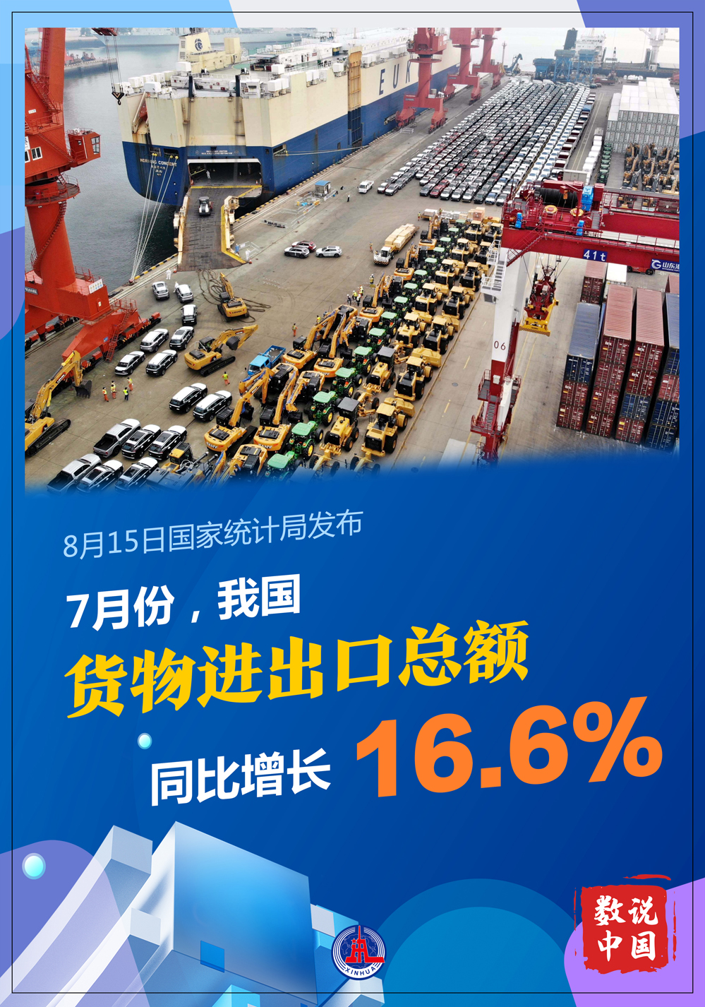 國家統(tǒng)計局8月15日發(fā)布數(shù)據(jù)顯示,7月份,貨物進(jìn)出口總額同比增長16.6%,比上月加快2.3個百分點。