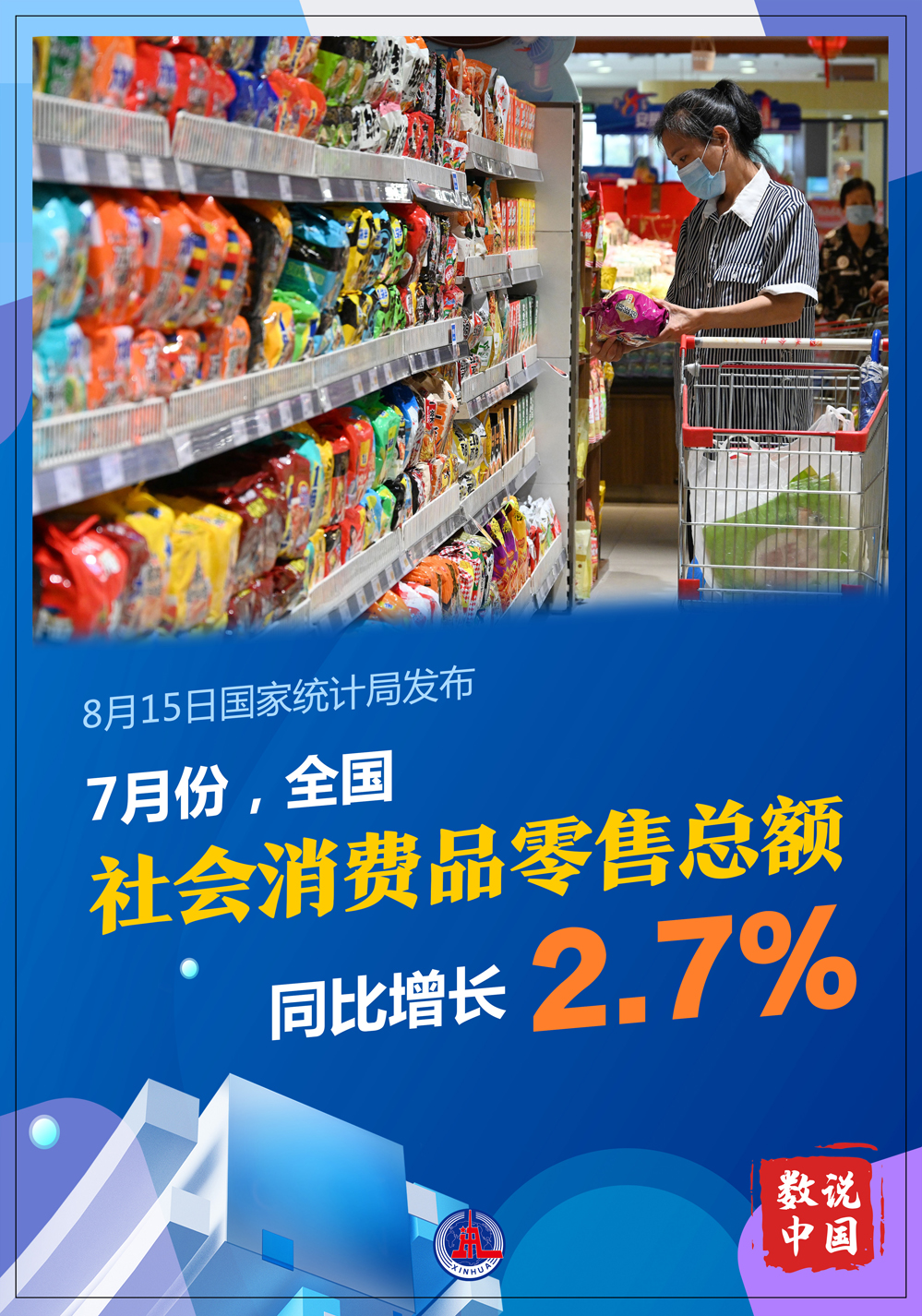 國家統(tǒng)計局8月15日發(fā)布數(shù)據(jù)顯示,7月份,社會消費(fèi)品零售總額同比增長2.7%,比上月回落0.4個百分點(diǎn);環(huán)比增長0.27%。