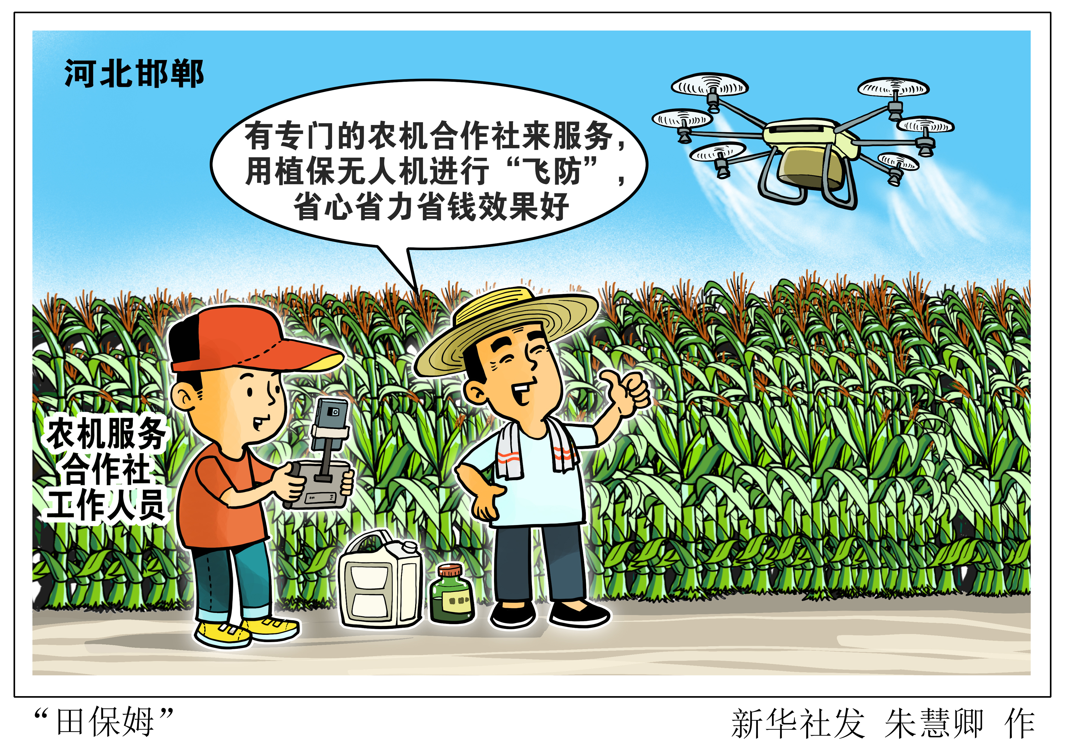 正值玉米銹病防治關鍵時期,河北省曲周縣河南疃鎮(zhèn)李于自口村村南,兩臺植保無人機不到一個小時就完成了一百多畝玉米的噴藥工作。