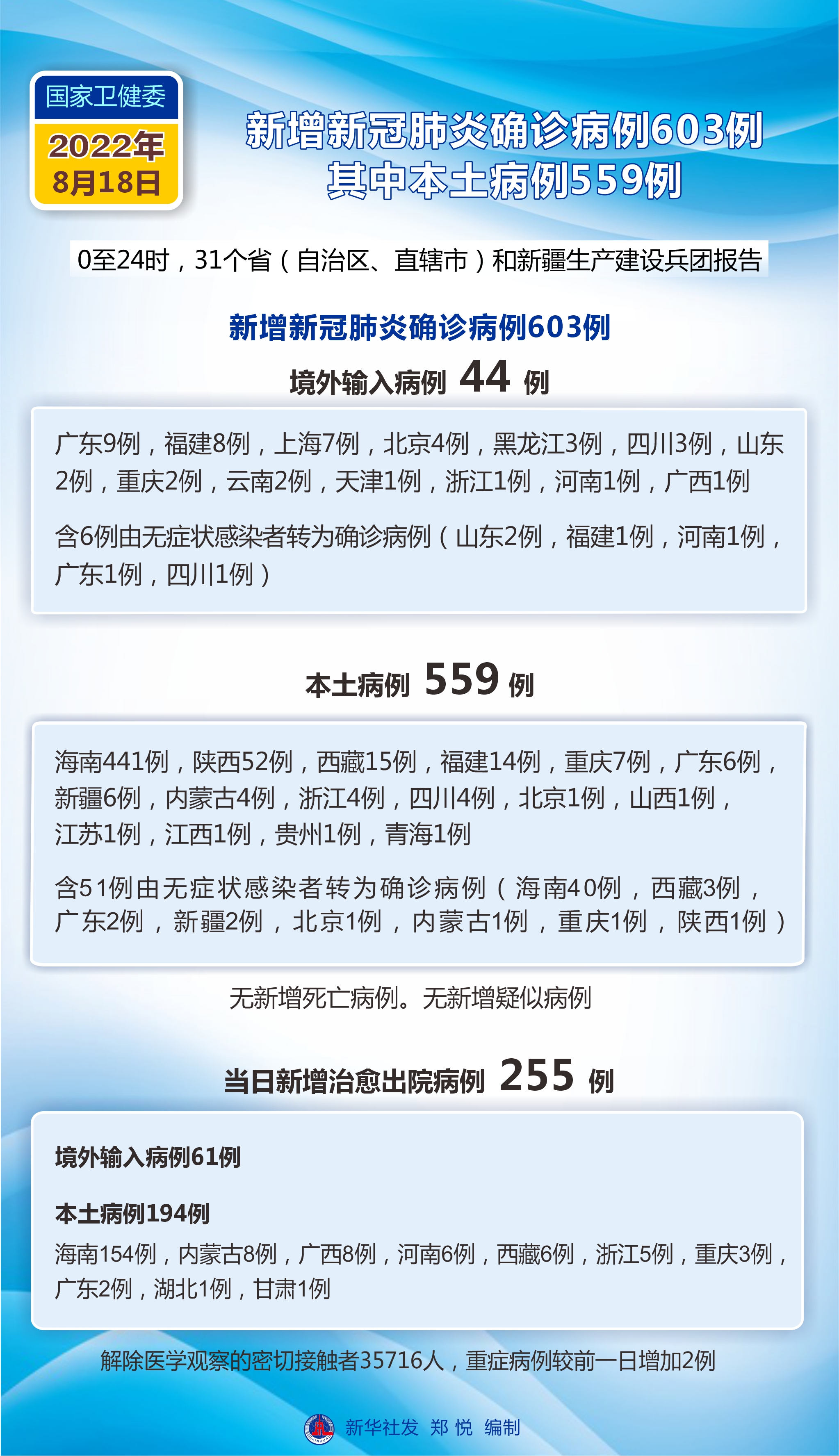 國(guó)家衛(wèi)健委:8月18日新增新冠肺炎確診病例603例 其中本土病例559例