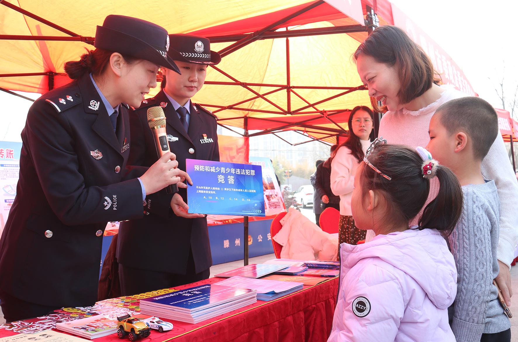 3月4日,山東省滕州市公安局北辛派出所組織民輔警走上街頭擺攤設(shè)點(diǎn),通過有獎競答、趣味互動等方式為市民提供法律咨詢服務(wù)。