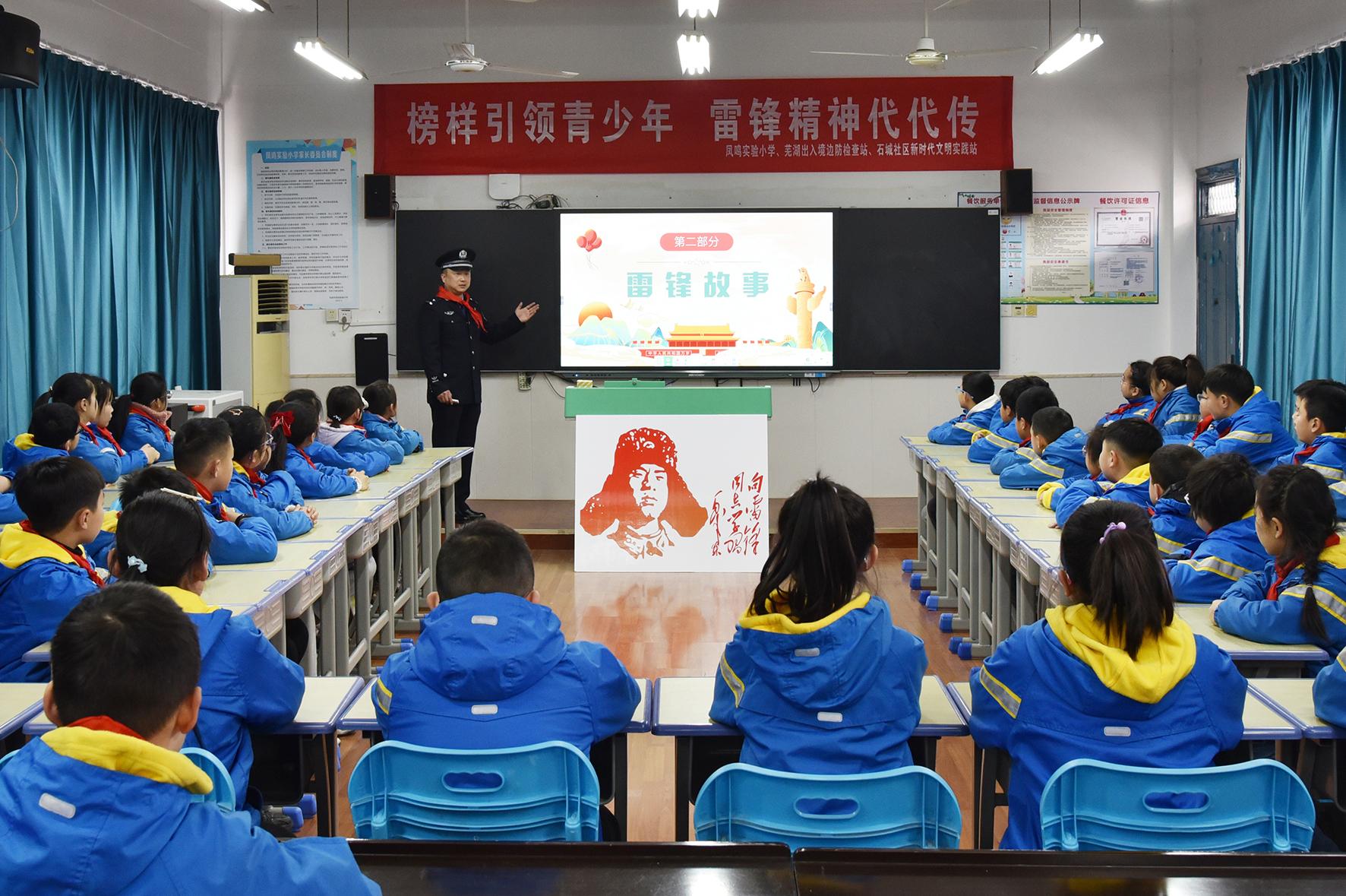 3月3日,安徽蕪湖邊境檢查站民警與鳳鳴實(shí)驗(yàn)小學(xué)共同開展“榜樣引領(lǐng)青少年 雷鋒精神代代傳”主題活動。
