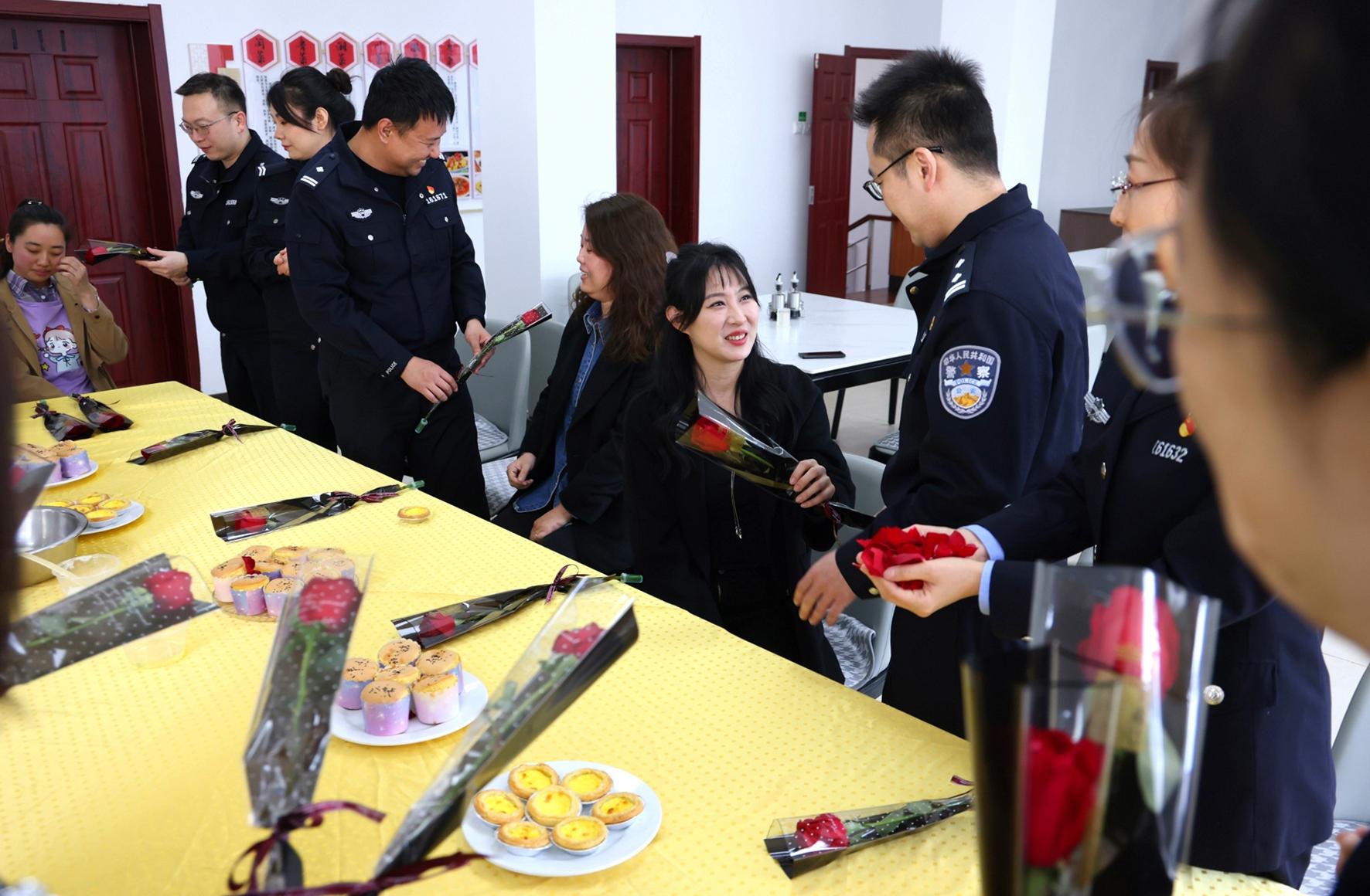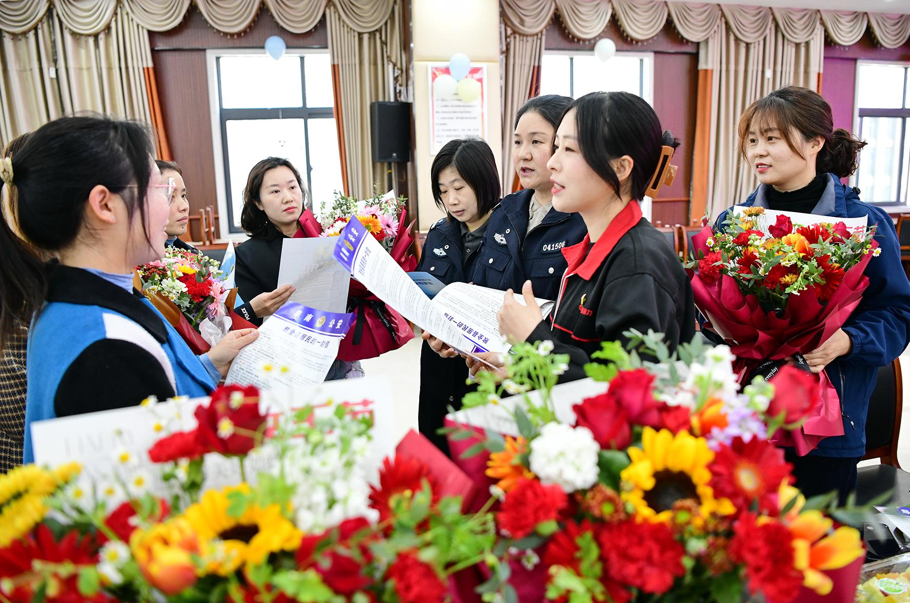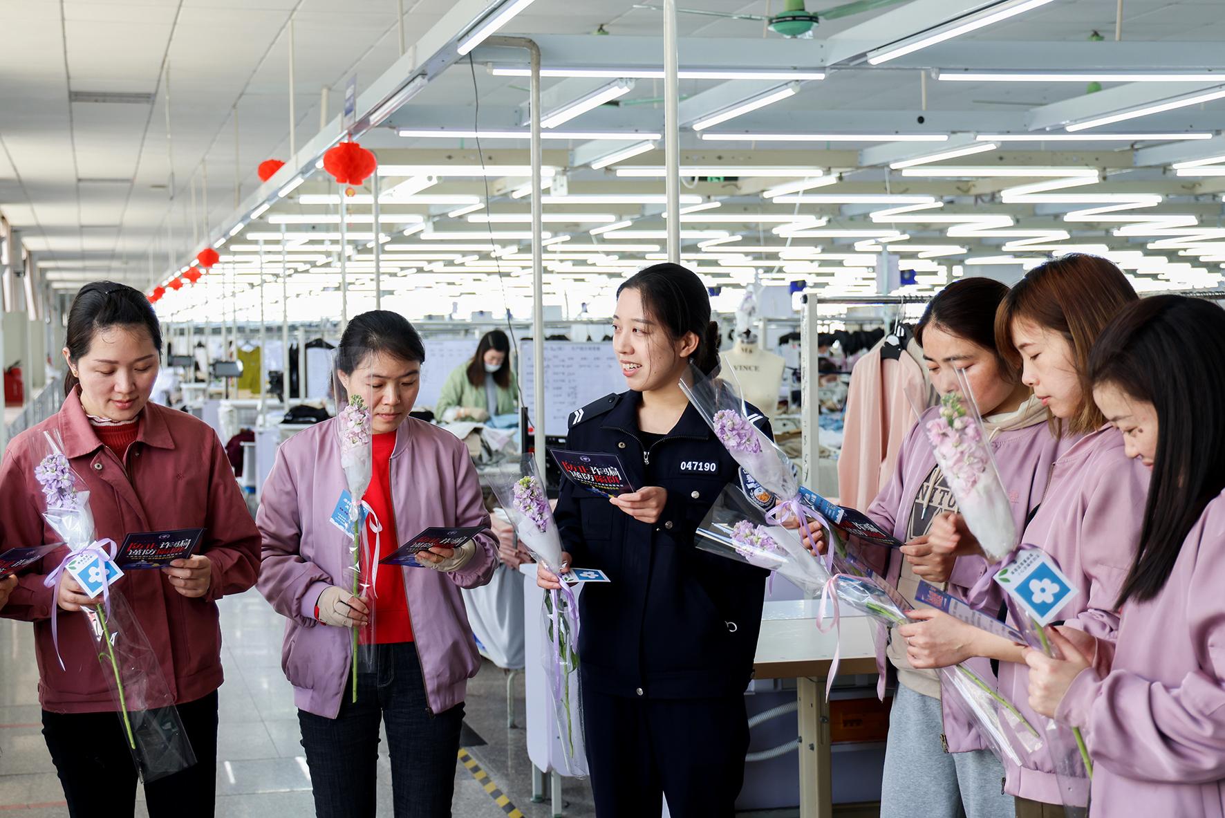 3月7日,浙江省嘉興市公安局南湖區(qū)分局七星派出所女民警走進轄區(qū)企業(yè),為女員工們送上帶有反詐小貼紙的“三八”節(jié)祝福鮮花。