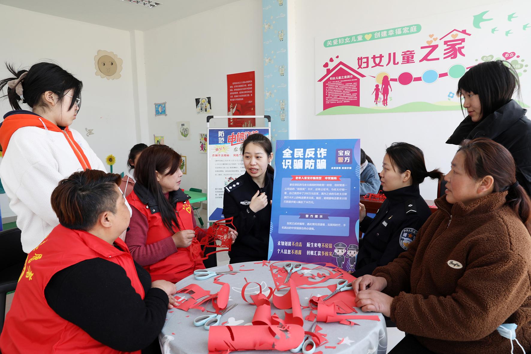 3月7日,江蘇省寶應(yīng)縣公安局女民警在新豐村婦女兒童之家宣傳反家庭暴力法及反詐知識。