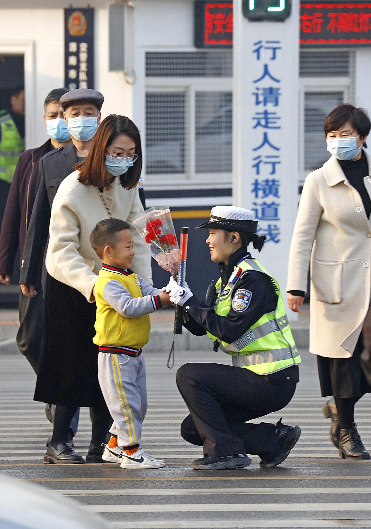 3月7日,陜西省渭南市區(qū)樂天大街與倉程路十字執(zhí)勤點,女民警雷雨晴正在執(zhí)勤,忽然一位小朋友拿著一束鮮花跑到她面前說:“阿姨,您辛苦了,節(jié)日快樂!”