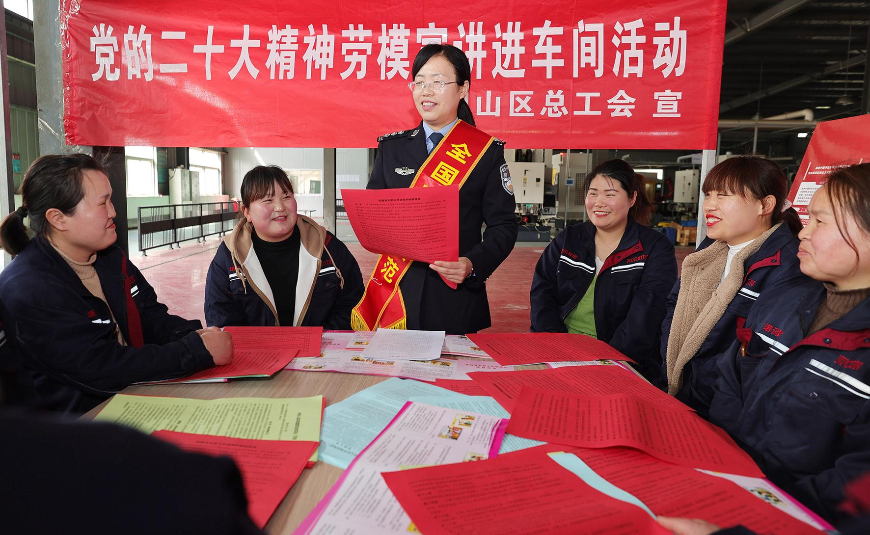 3月7日,安徽省淮北市相山經(jīng)濟開發(fā)區(qū)企業(yè)生產(chǎn)車間,全國勞動模范、淮北市公安局三堤口派出所所長王懷芬為一線女職工講述立足崗位作貢獻的奮斗故事。