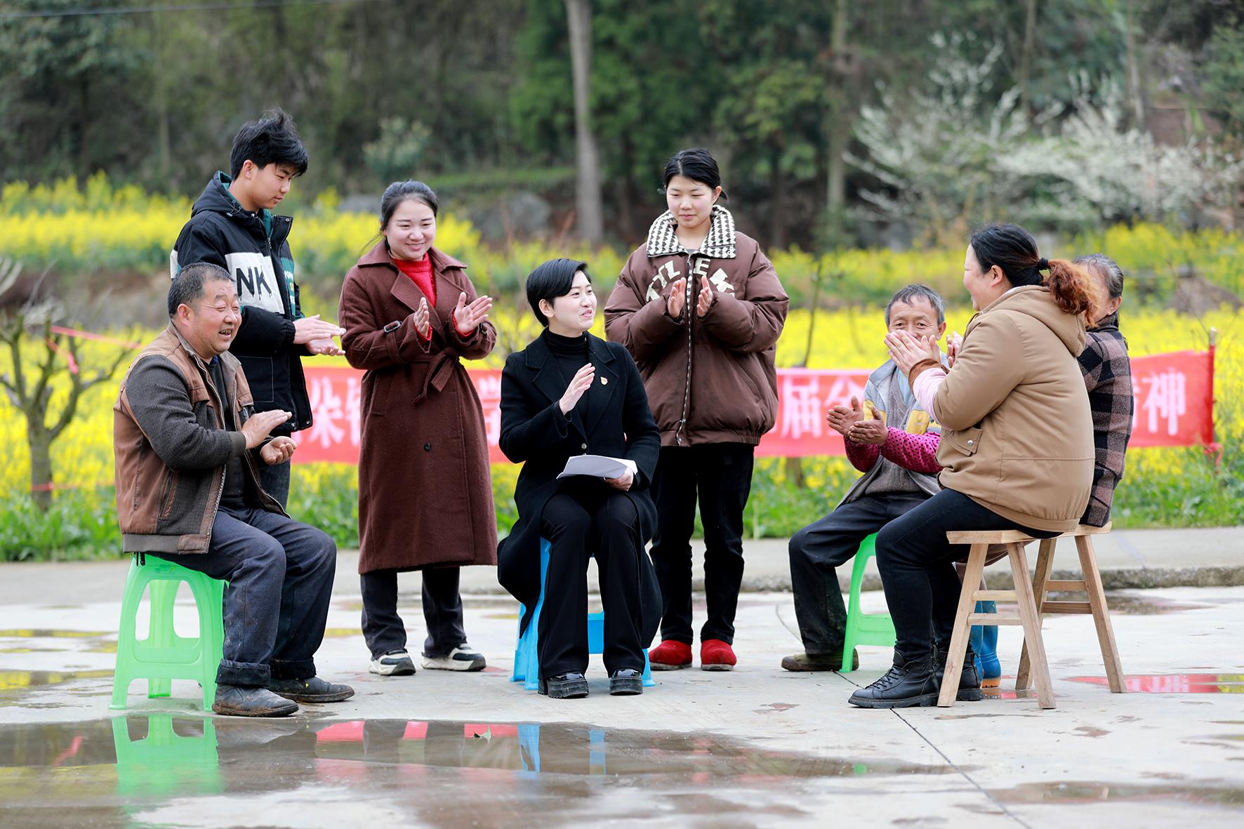 3月19日,全國(guó)人大代表、貴州省黔西市雨朵鎮(zhèn)黨委書記付慶梅(左四)在雨朵鎮(zhèn)小水井村,向村民傳達(dá)兩會(huì)精神,分享感受和體會(huì)。