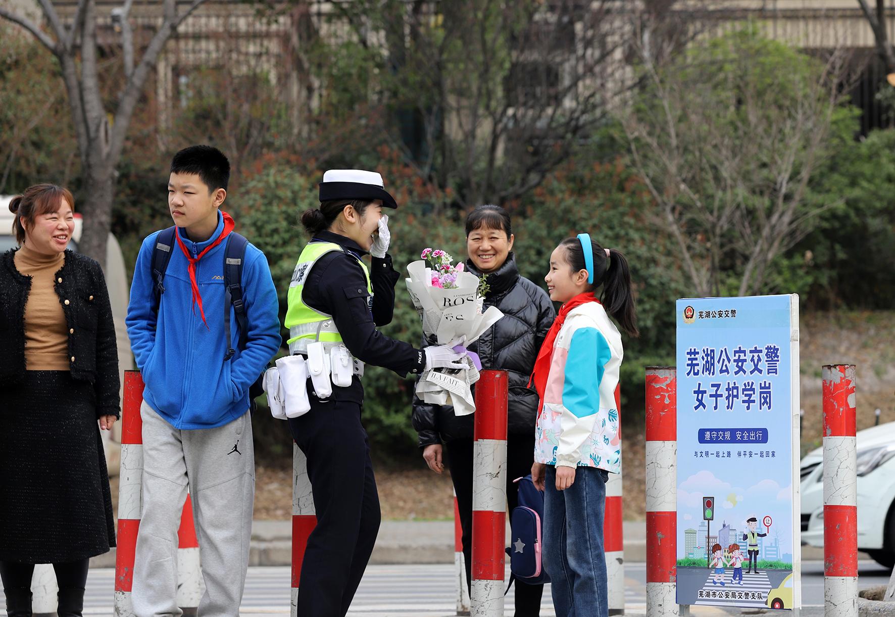 3月8日,安徽省蕪湖市安徽師范大學(xué)附屬小學(xué)西校區(qū)的一位小學(xué)生向正在“護(hù)學(xué)崗”執(zhí)勤的女民警送上節(jié)日的祝福。