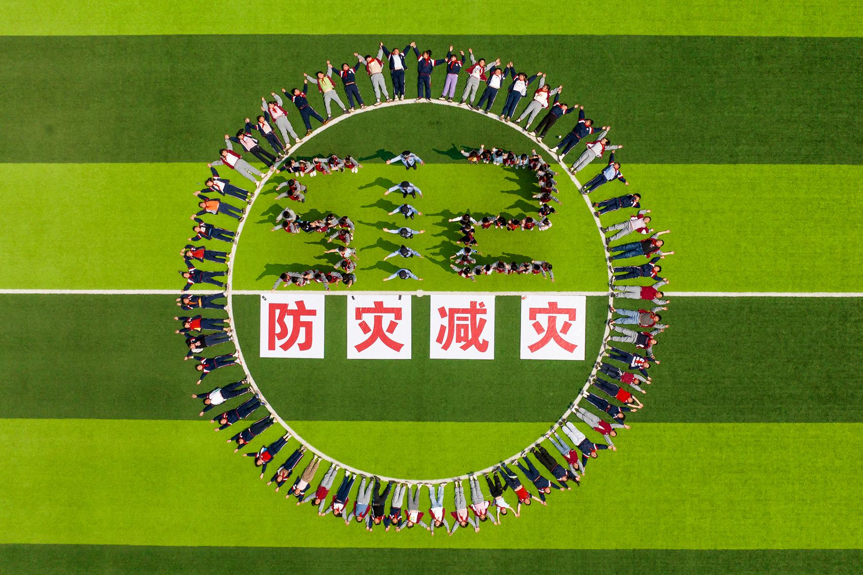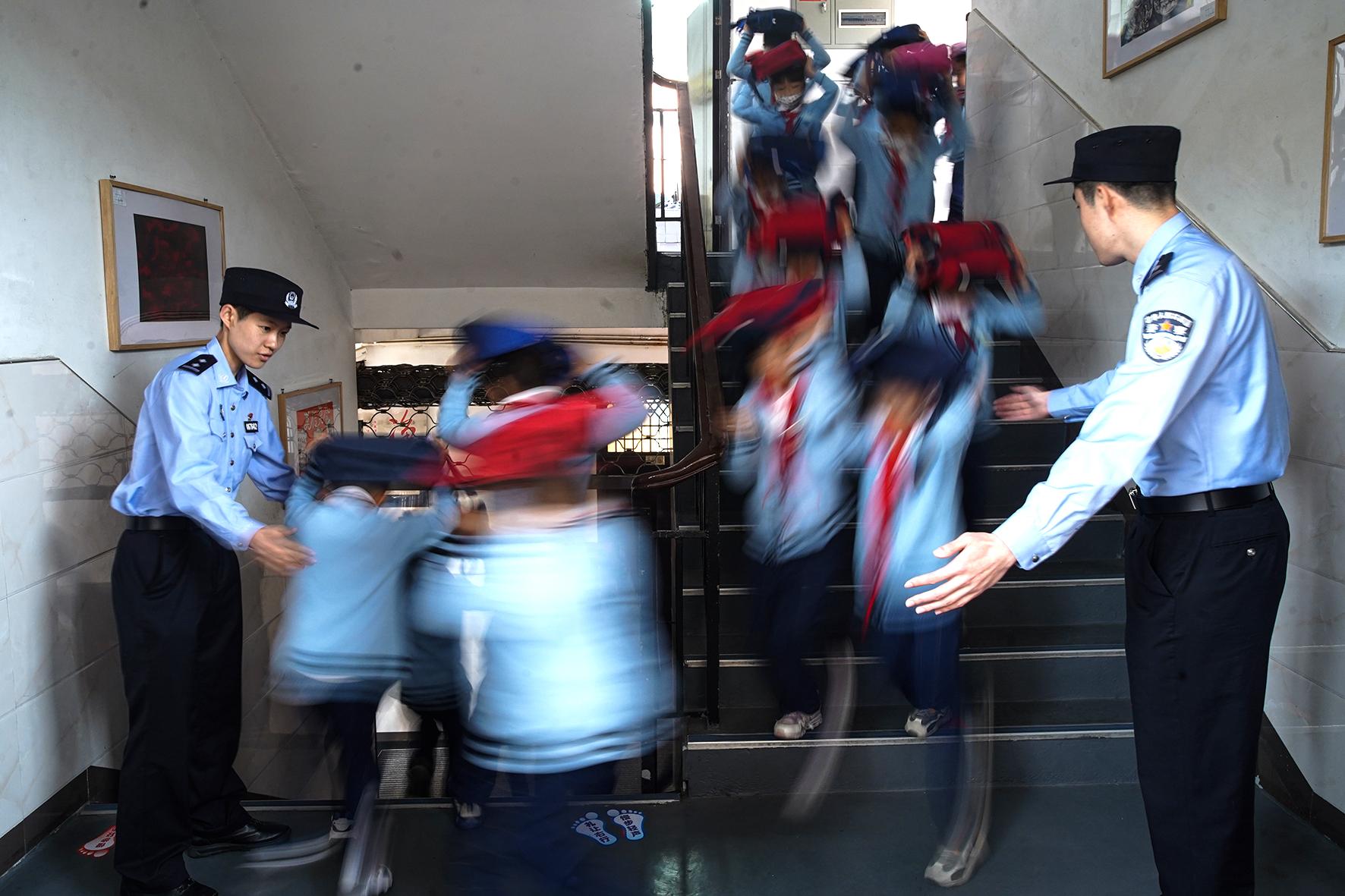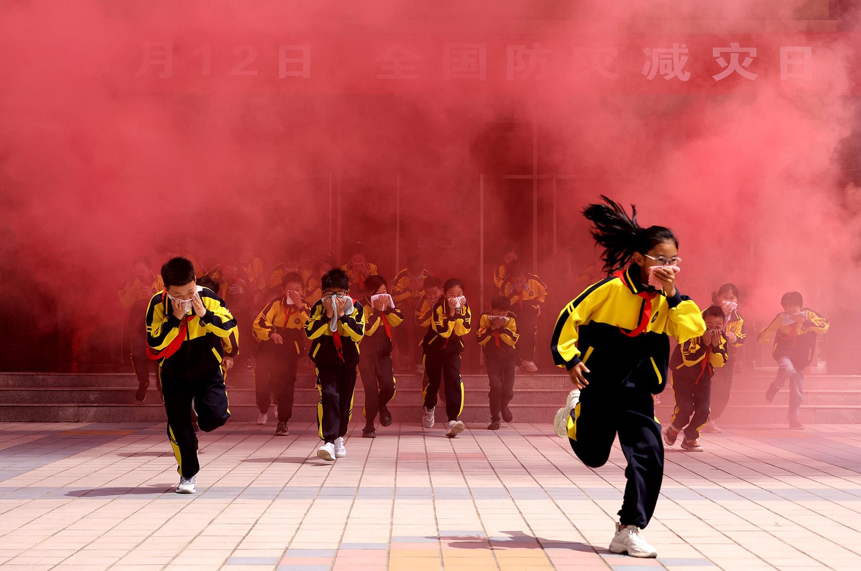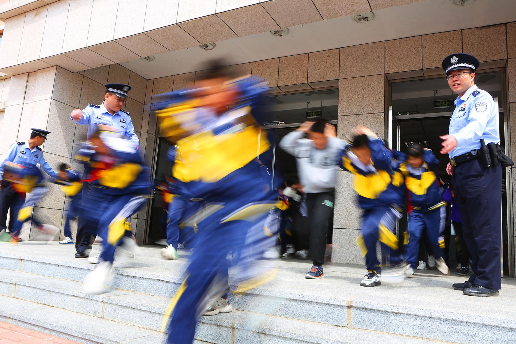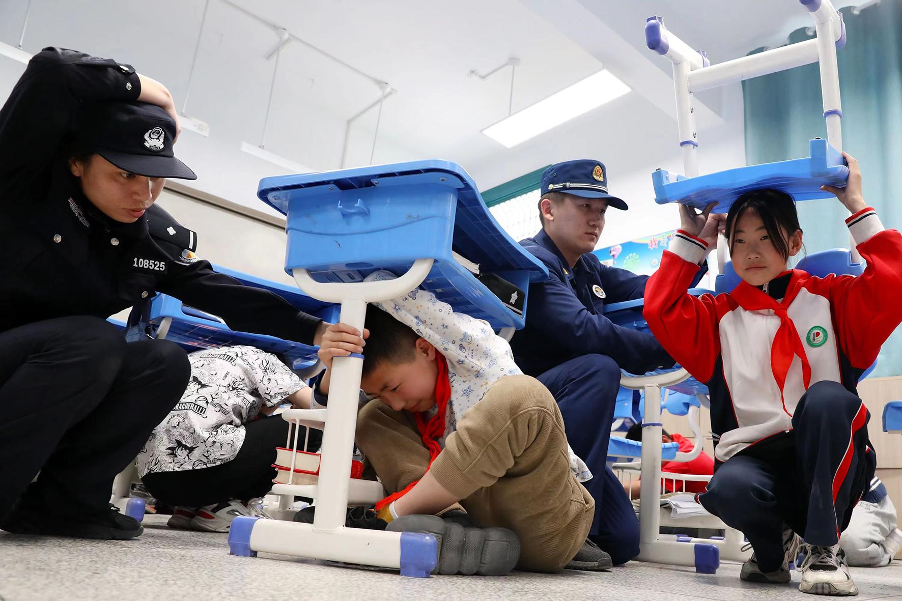 5月11日,在山東省棗莊市市中區(qū)開展的防災減災應急演練活動中,東湖小學學生在進行地震防災應急避險演練。