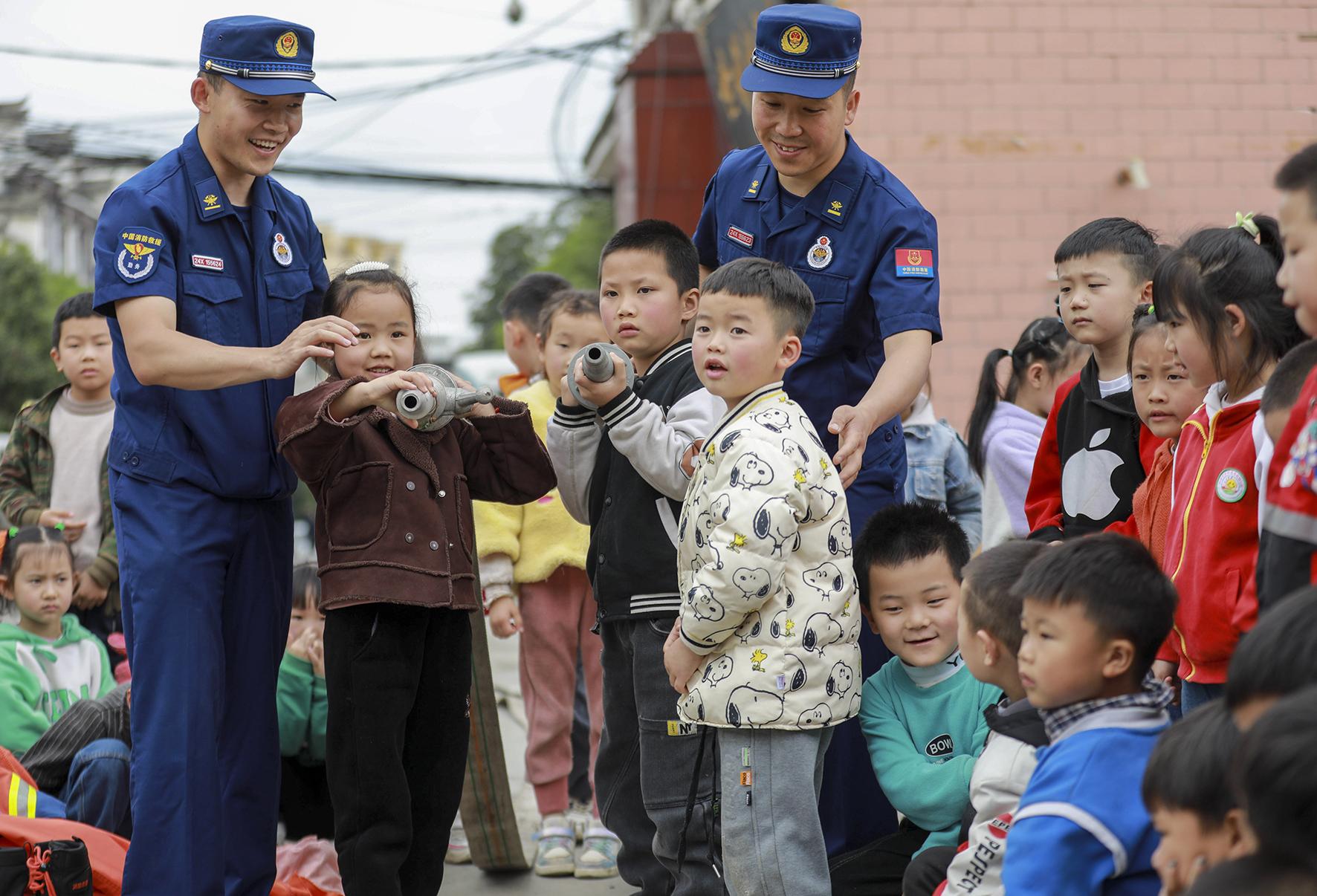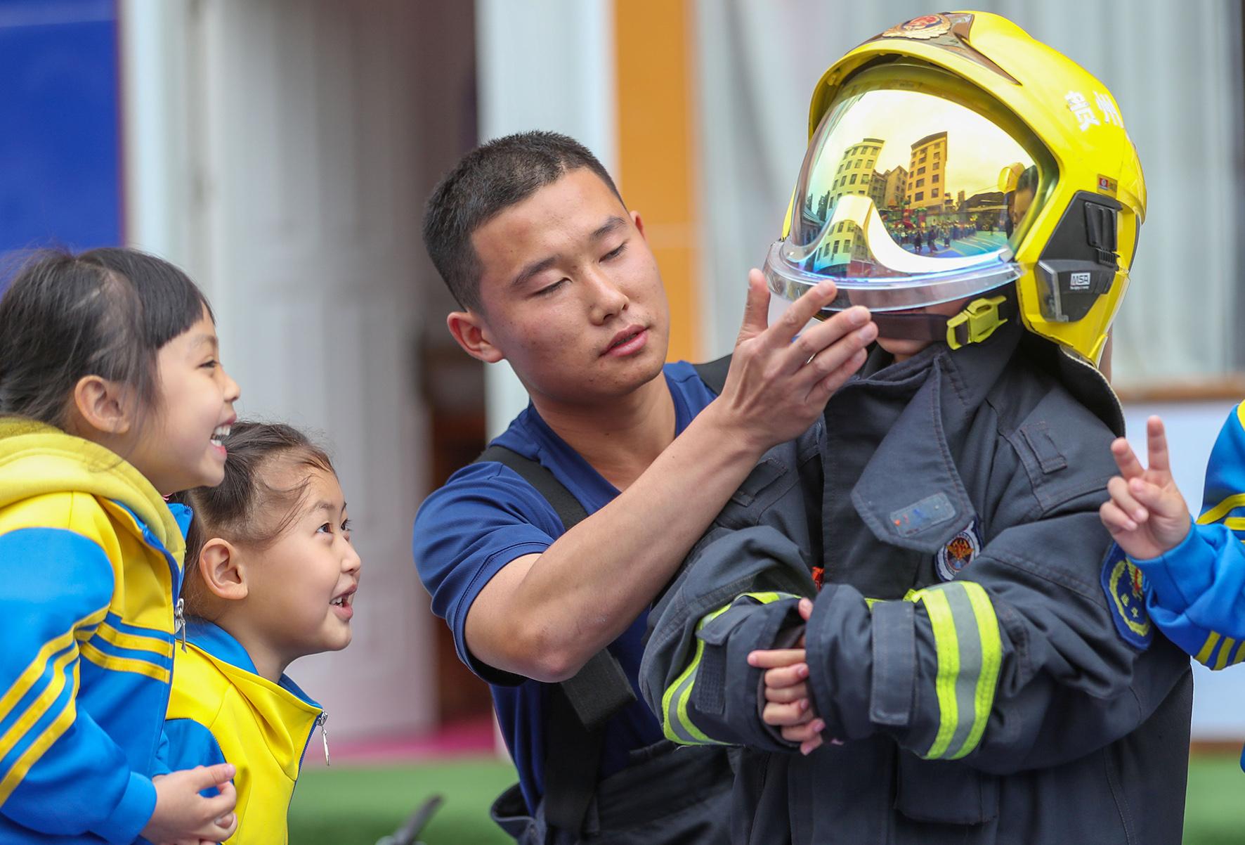 5月12日,貴州省銅仁市玉屏侗族自治縣童樂幼兒園舉行防災減災知識普及活動,消防員指導小朋友們體驗消防服。