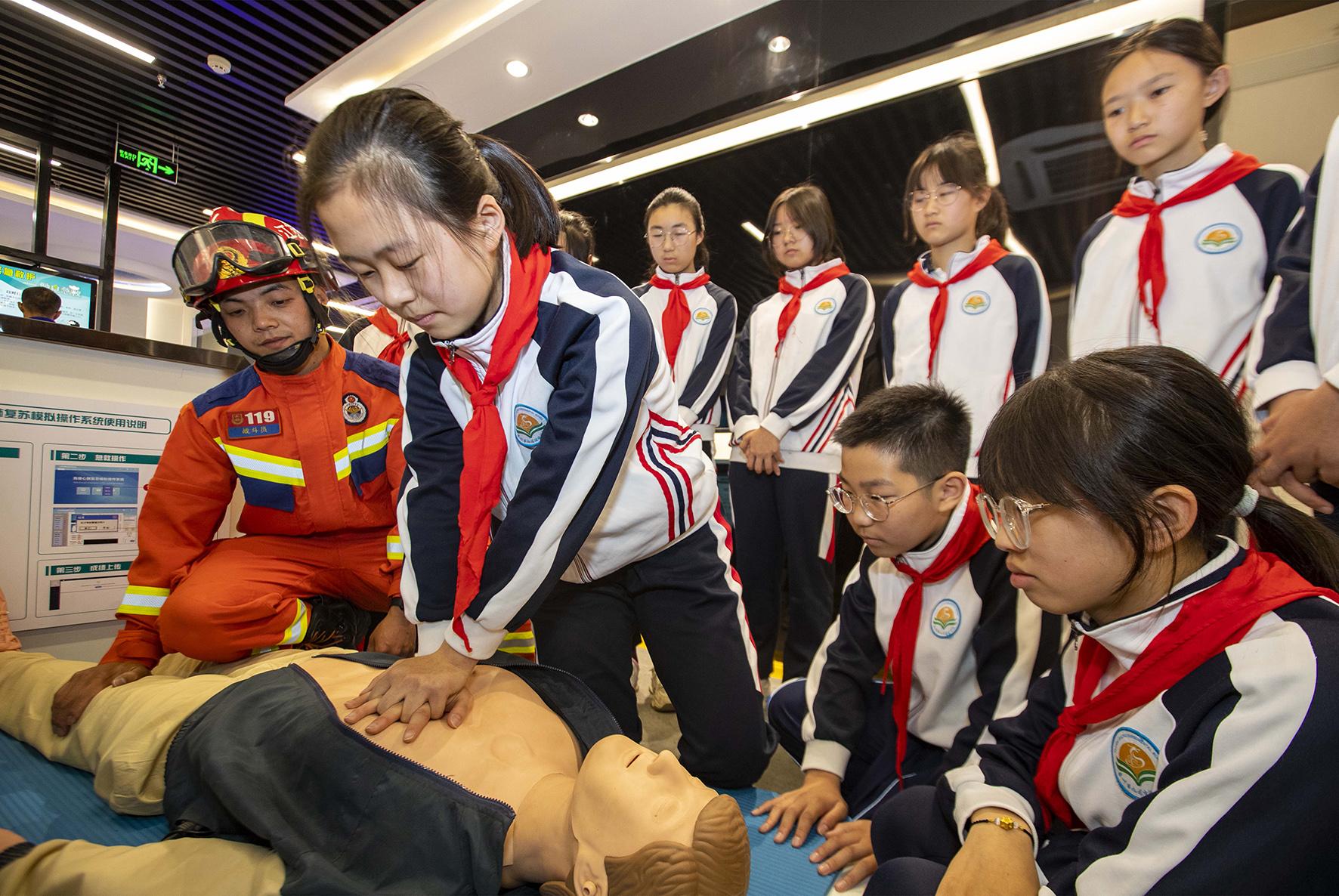 5月11日,在江蘇省泰州市消防科普教育基地,消防救援人員給九龍實驗學校學生講解心肺復蘇知識。