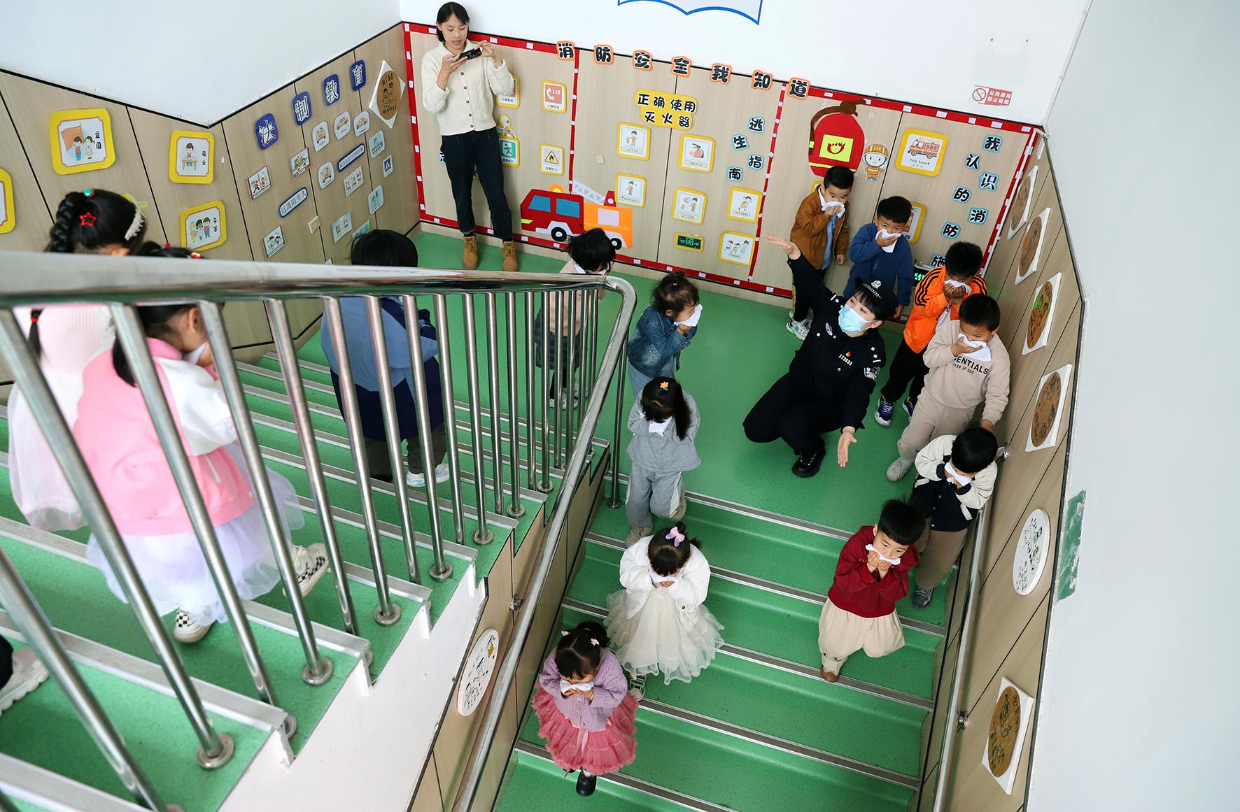 5月11日,浙江省臺州市路橋區(qū)橫街派出所民警在轄區(qū)育英幼兒園組織小朋友開展消防逃生演練。