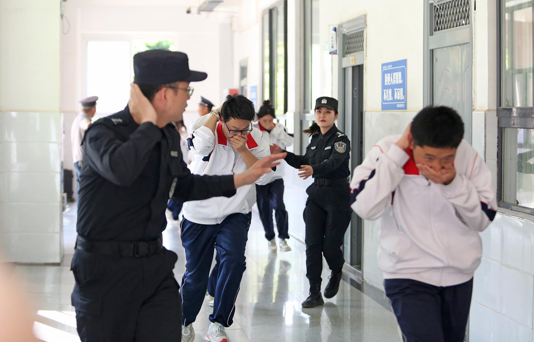 5月12日,陜西省渭南市公安局臨渭分局巡特警大隊開展全國防災減災日主題宣傳進校園活動,特警隊員組織學生有序“逃生”。