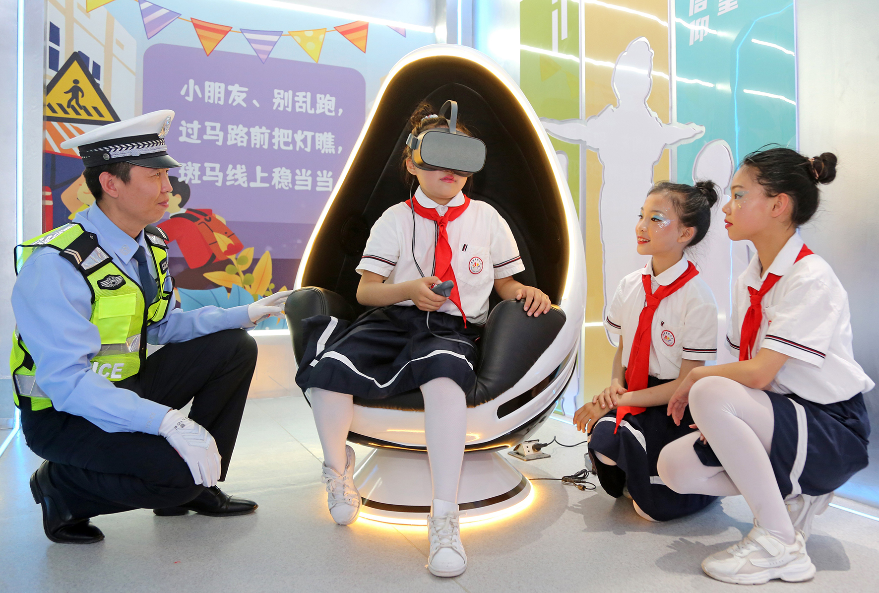5月30日,陜西省渭南市高新區(qū)紅旗駕校交通安全教育基地兒童VR交通安全模擬體驗區(qū),小學(xué)生在沉浸式體驗道路交通安全。當(dāng)日,渭南市公安局交警支隊高新大隊開展“知危險 會避險”交通安全主題宣傳活動。