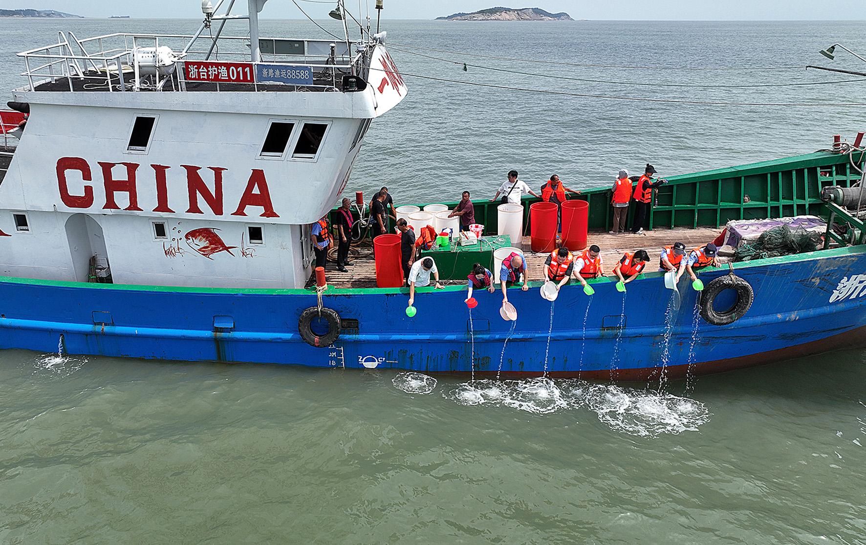 7月19日,在浙江省臺州市路橋區(qū)金清鎮(zhèn)近海海域,當地黨員干部、政法干警、人大代表、政協(xié)委員、漁民代表等開展海洋增殖放流活動,向大海投放蝦苗2050萬尾。