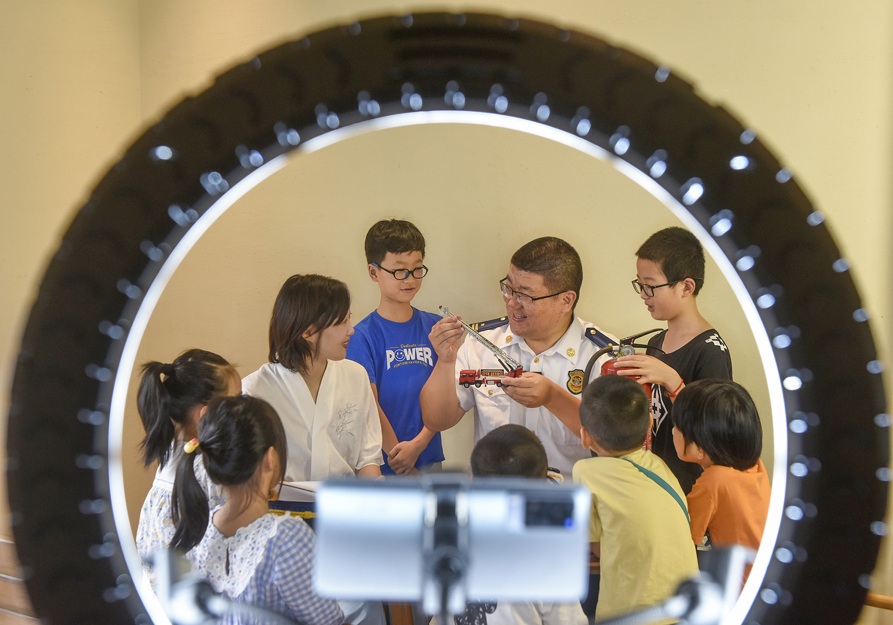 8月4日,在浙江省寧波市鎮(zhèn)海區(qū)澥浦鎮(zhèn)十七房村信息傳播中心,消防員一邊給留守兒童現(xiàn)場教學(xué)示范,一邊直播暑期消防安全知識。