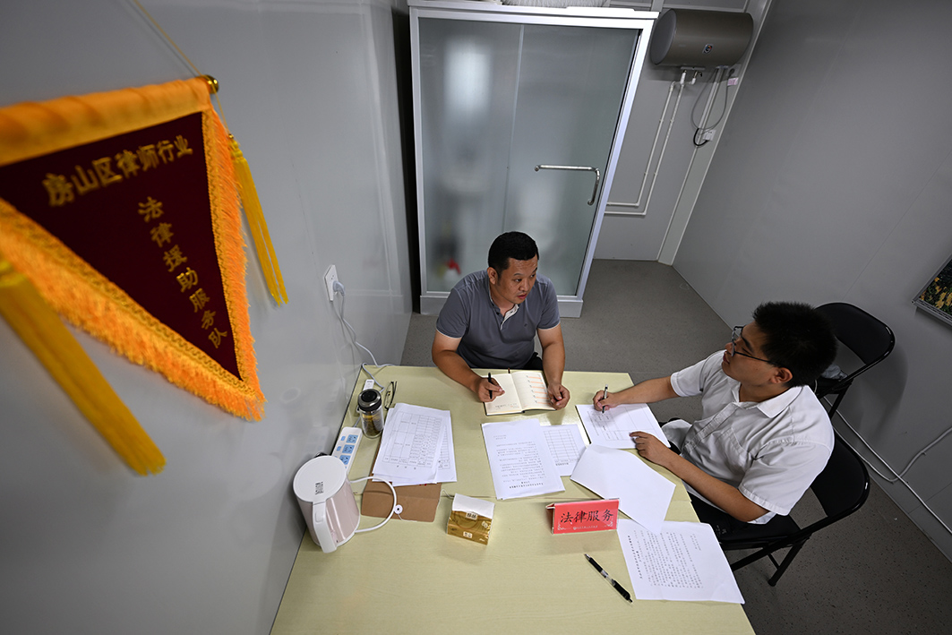 安置點司法工作室,房山司法局基層科科長及識宇(左)與值班律師盤點工作重點。