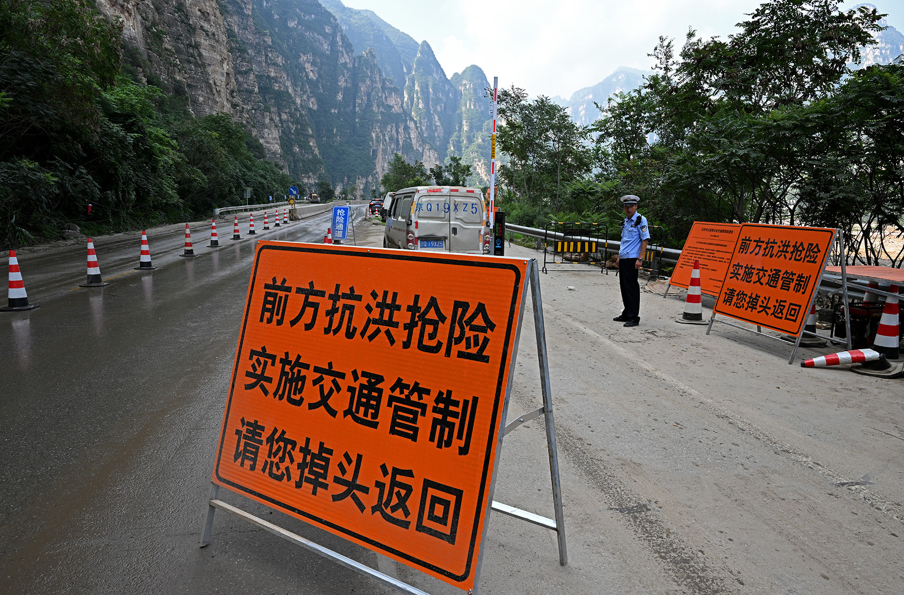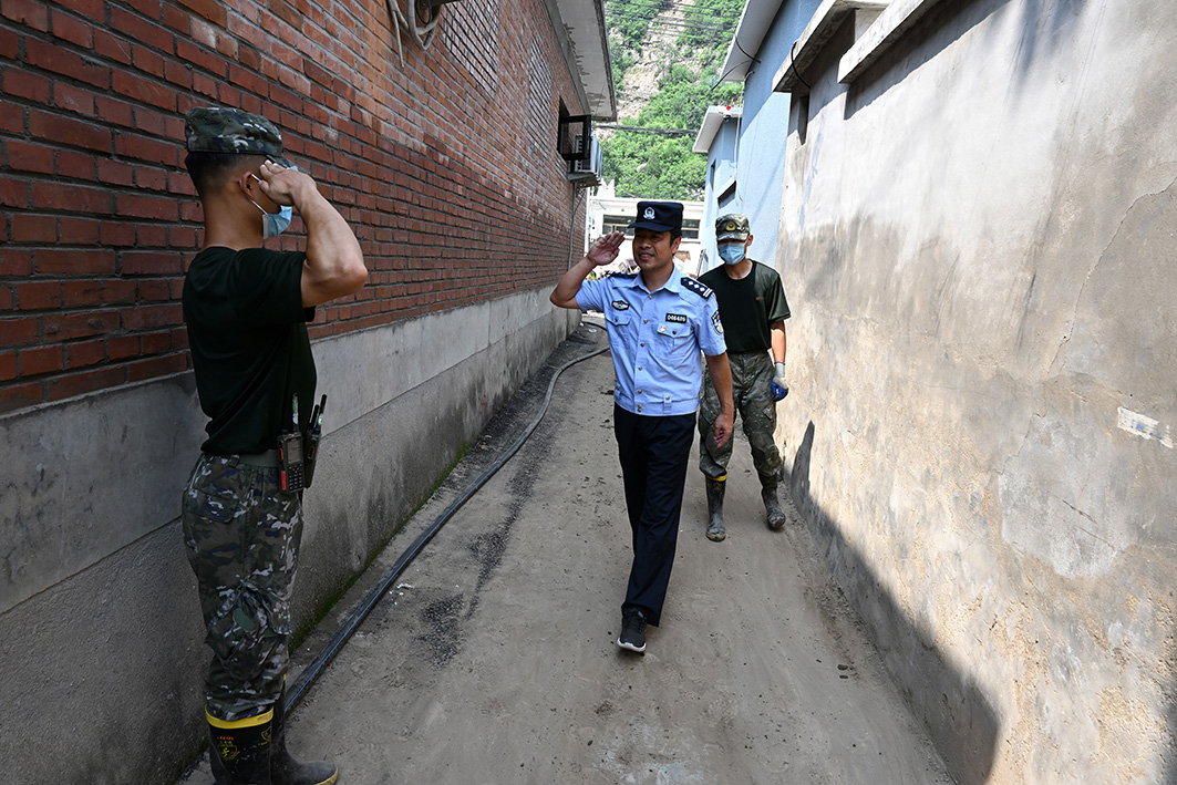 7月29日至8月2日,北京遭遇特大暴雨災(zāi)害,房山區(qū)成為人員財產(chǎn)損失最嚴重的地區(qū)之一。張坊檢查崗是進入受災(zāi)嚴重地區(qū)的第一道崗,在被損毀的道路尚未恢復(fù)通行能力前,只有救援相關(guān)車輛和當(dāng)?shù)卮迕癖辉试S進入?!爱?dāng)前首要任務(wù)是保證救援保障力量的順暢進出?!比f寧大隊民警宗曉磊告訴記者,從7月28日汛前備勤起,他和同事們就堅守在這條進山通道,迄今已20多天。