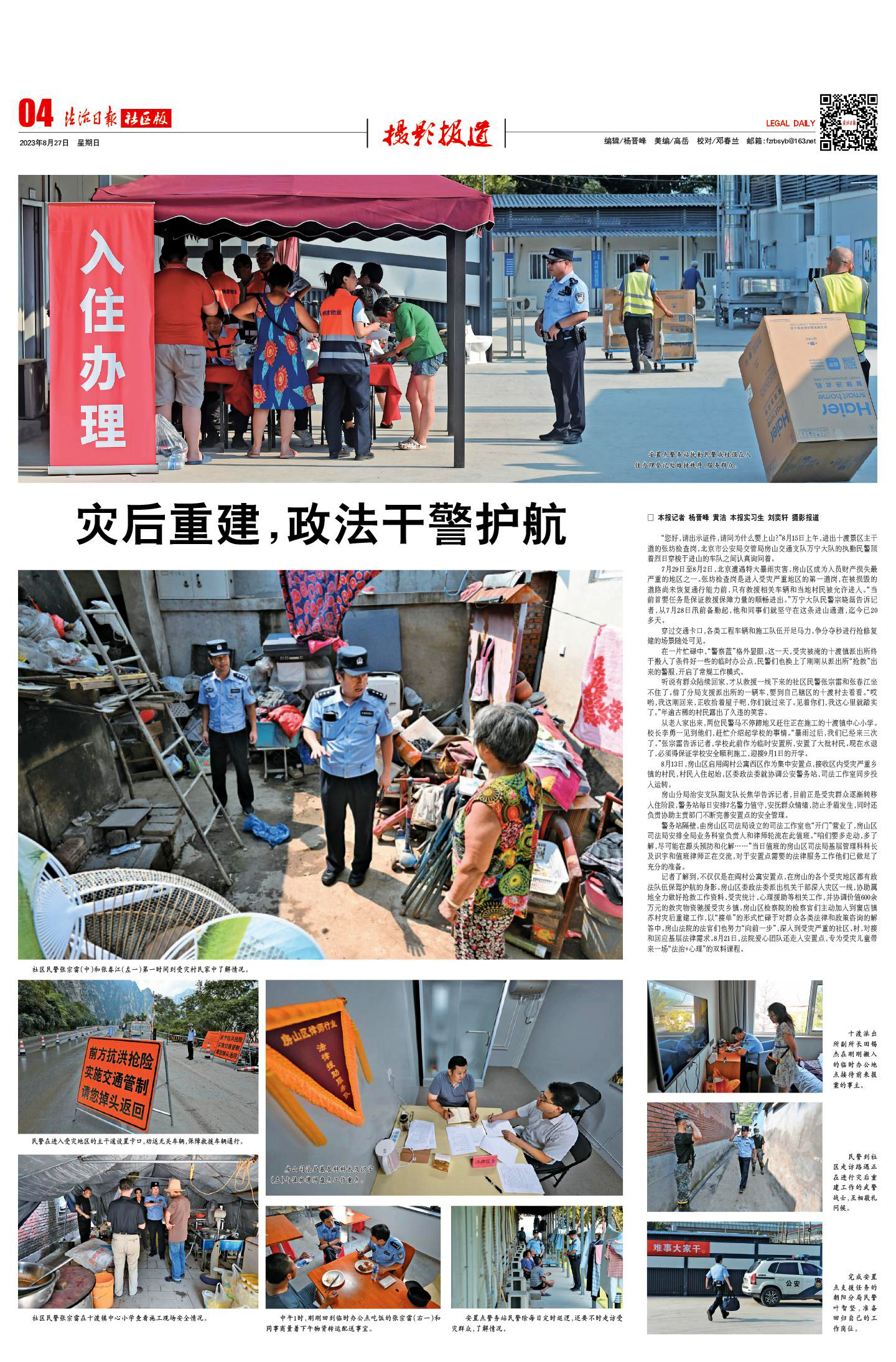 記者了解到,不僅僅是在閻村公寓安置點,在房山的各個受災(zāi)地區(qū)都有政法隊伍保駕護航的身影。房山區(qū)委政法委派出機關(guān)干部深入災(zāi)區(qū)一線,協(xié)助屬地全力做好搶救工作資料、受災(zāi)統(tǒng)計、心理援助等相關(guān)工作,并協(xié)調(diào)價值600余萬元的救災(zāi)物資馳援受災(zāi)鄉(xiāng)鎮(zhèn)。房山區(qū)檢察院的檢察官們主動加入到竇店鎮(zhèn)蘇村災(zāi)后重建工作,以“接單”的形式忙碌于對群眾各類法律和政策咨詢的解答中。房山法院的法官們也努力“向前一步”,深入到受災(zāi)嚴重的社區(qū)、村,對接和回應(yīng)基層法律需求。8月21日,法院愛心團隊還走入安置點,專為受災(zāi)兒童帶來一場“法治+心理”的雙料課程。