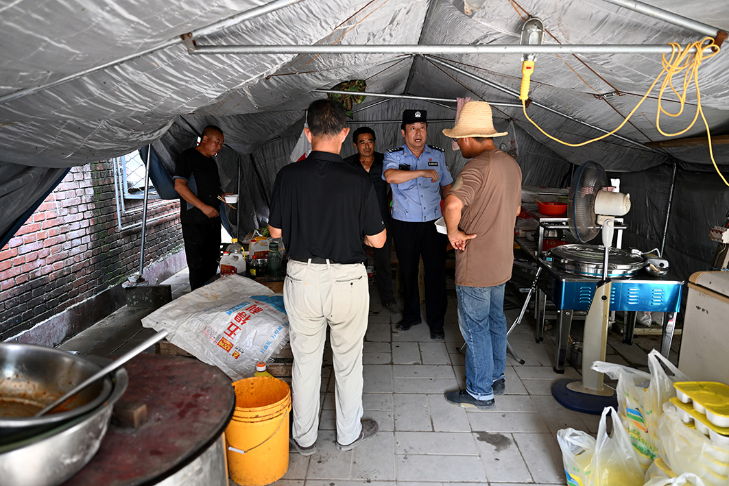 安置點警務(wù)站民警除每日定時巡邏,還要不時走訪受災(zāi)群眾,了解情況。
