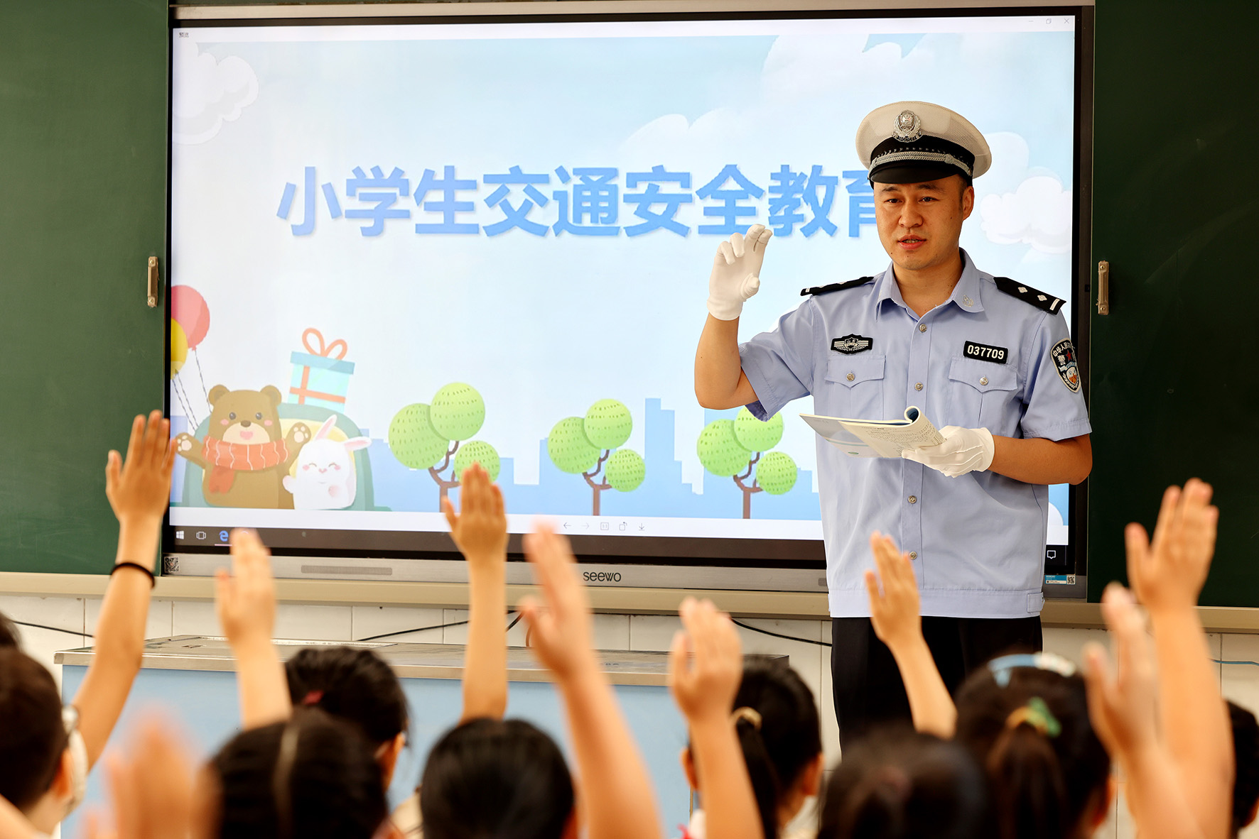 8月31日,山東省棗莊市公安局市中分局交通警察大隊(duì)民警在文化路小學(xué)對(duì)學(xué)生進(jìn)行交通安全教育。