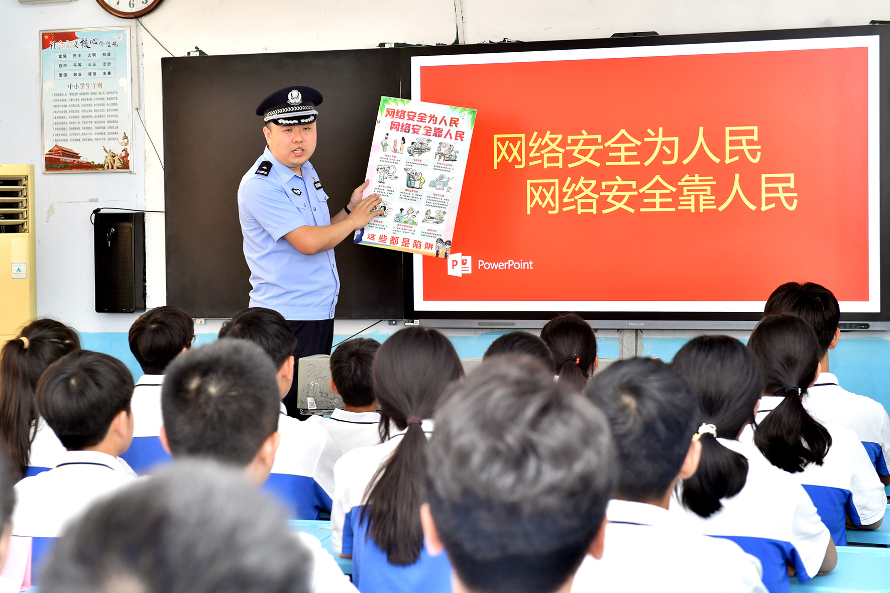 9月14日,山東省棗莊市公安局臺(tái)兒莊分局民警在第三十九中學(xué)給學(xué)生上網(wǎng)絡(luò)安全知識(shí)課。