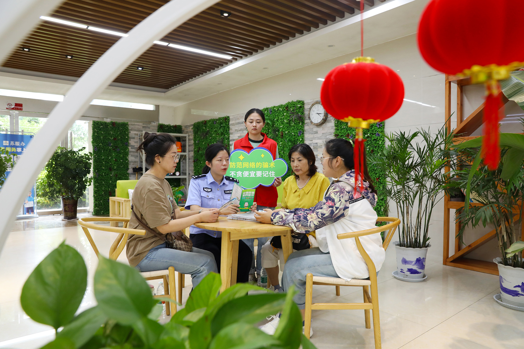 9月14日,江蘇省寶應(yīng)縣公安局沿河派出所民警在蓮花社區(qū)便民服務(wù)站給群眾講解網(wǎng)絡(luò)安全知識(shí)和防范電信網(wǎng)絡(luò)詐騙知識(shí)。