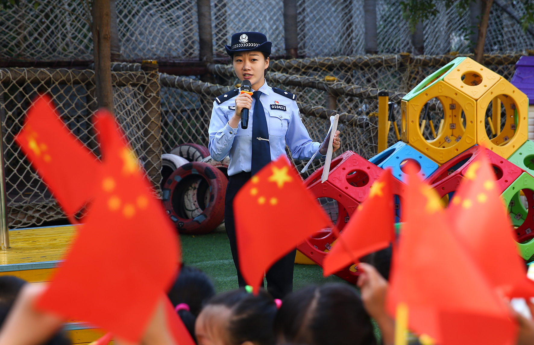 9月28日,山東省濟(jì)南市公安局市中區(qū)分局民警來到幼兒園開展愛國主義教育,喜迎國慶節(jié)。
