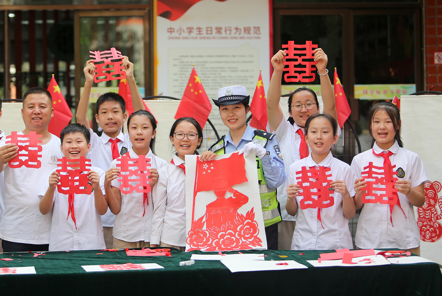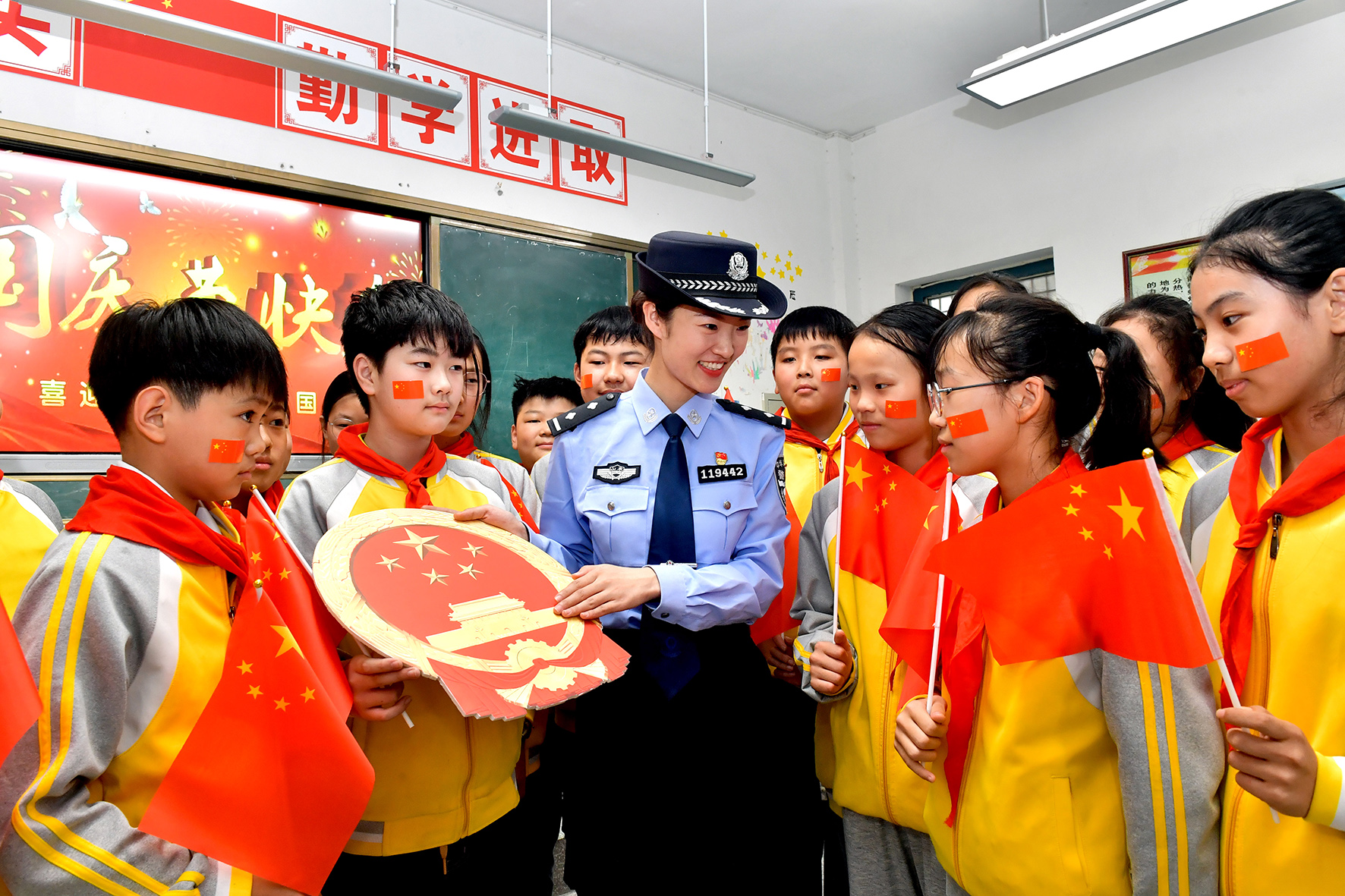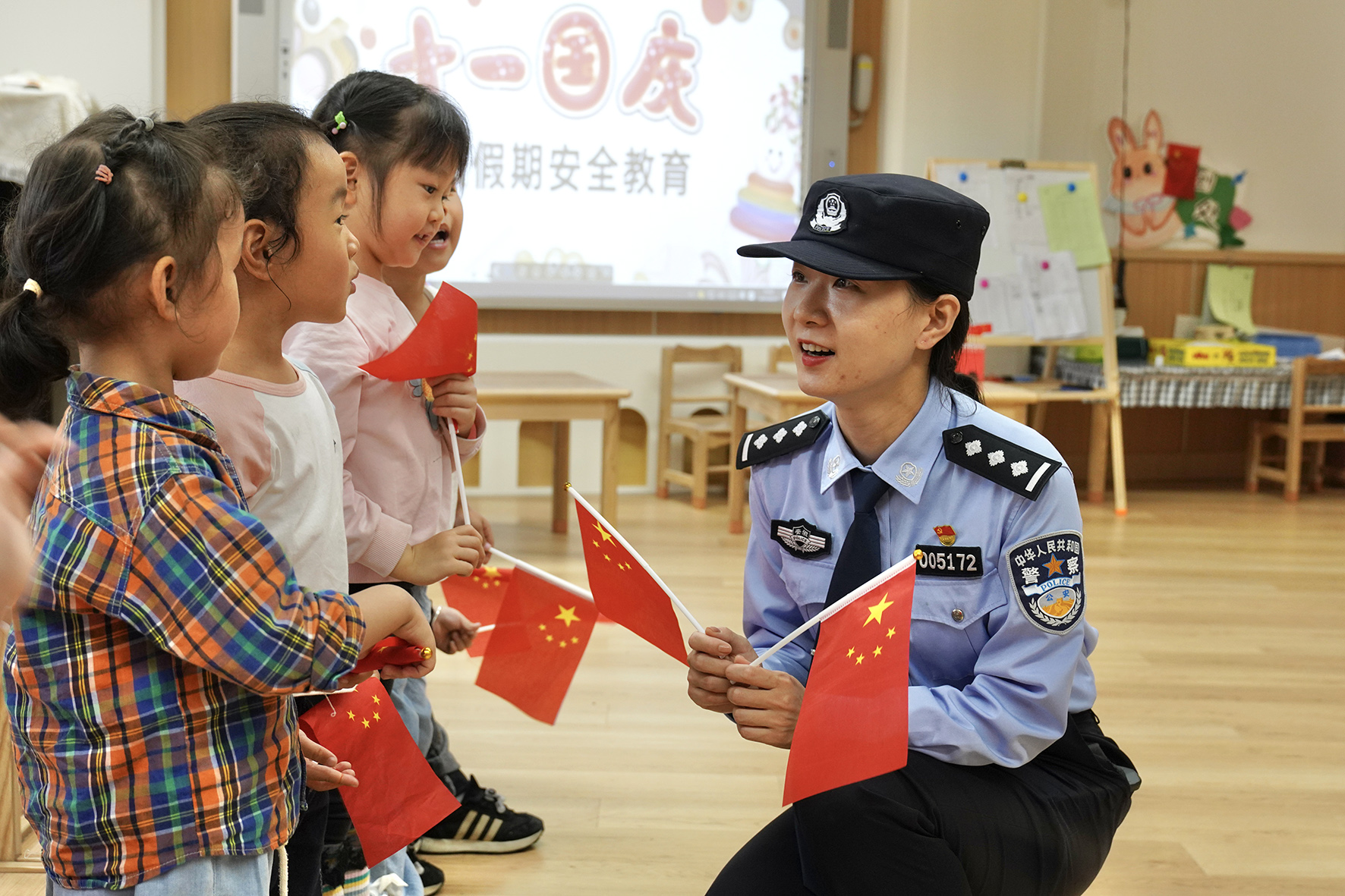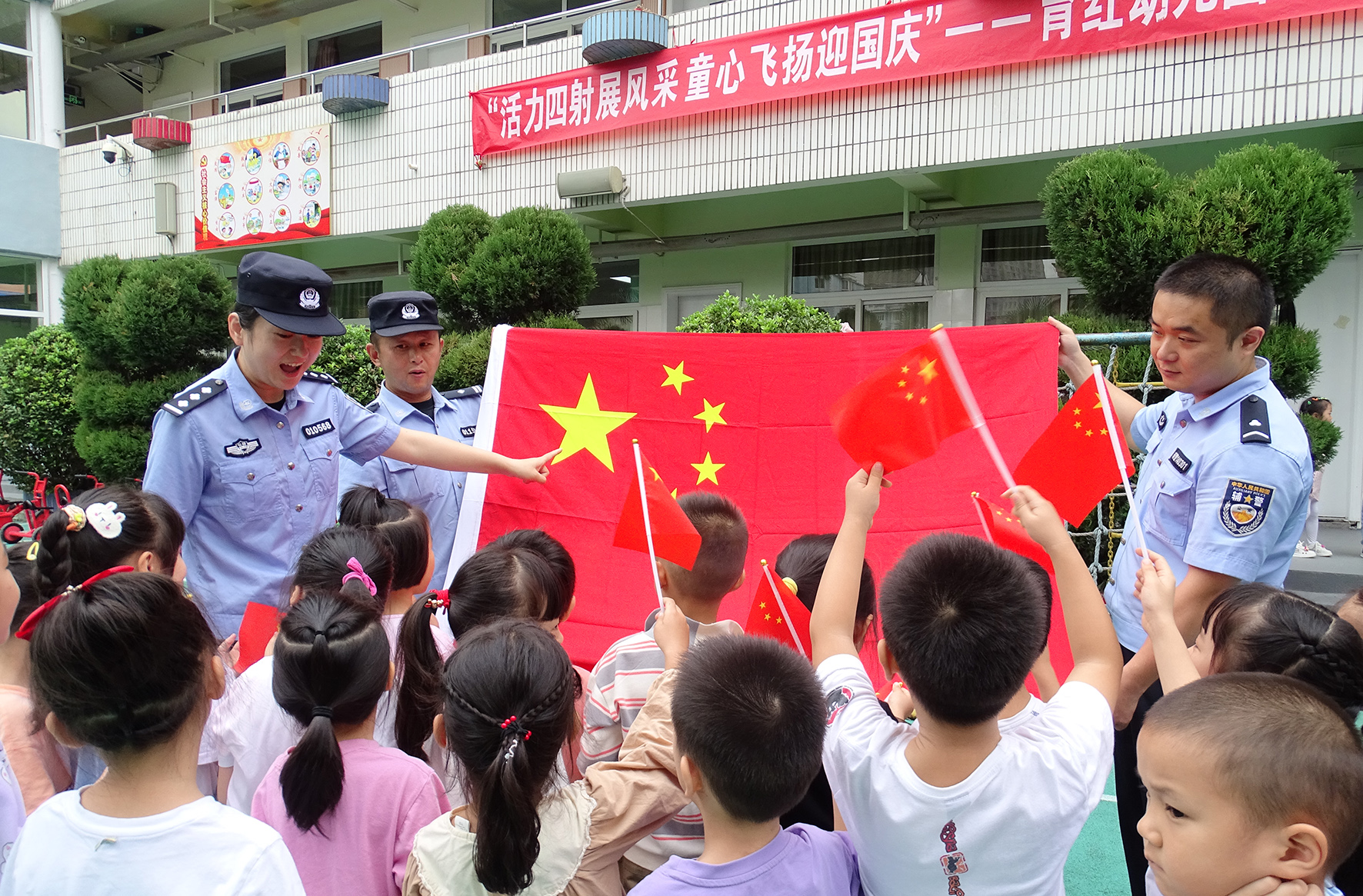 9月27日,安徽省合肥市公安局瑤海分局龍崗派出所民警輔警走進(jìn)轄區(qū)幼兒園開展“我為祖國送祝?!敝黝}教育活動。