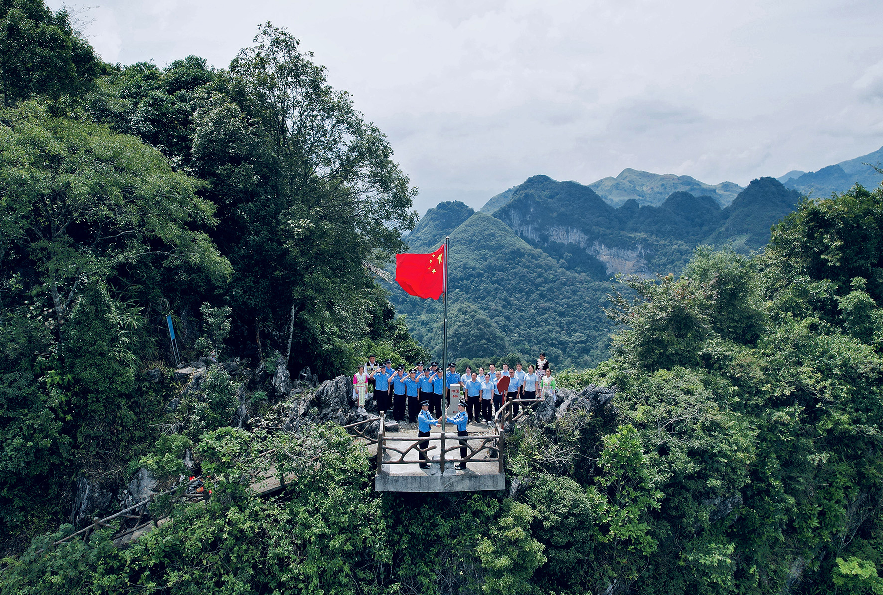 10月1日,廣西邊檢總站百色邊境管理支隊百南邊境派出所聯合駐地干部職工、少數民族群眾在祖國西南邊陲的中越588號界碑旁升起五星紅旗。