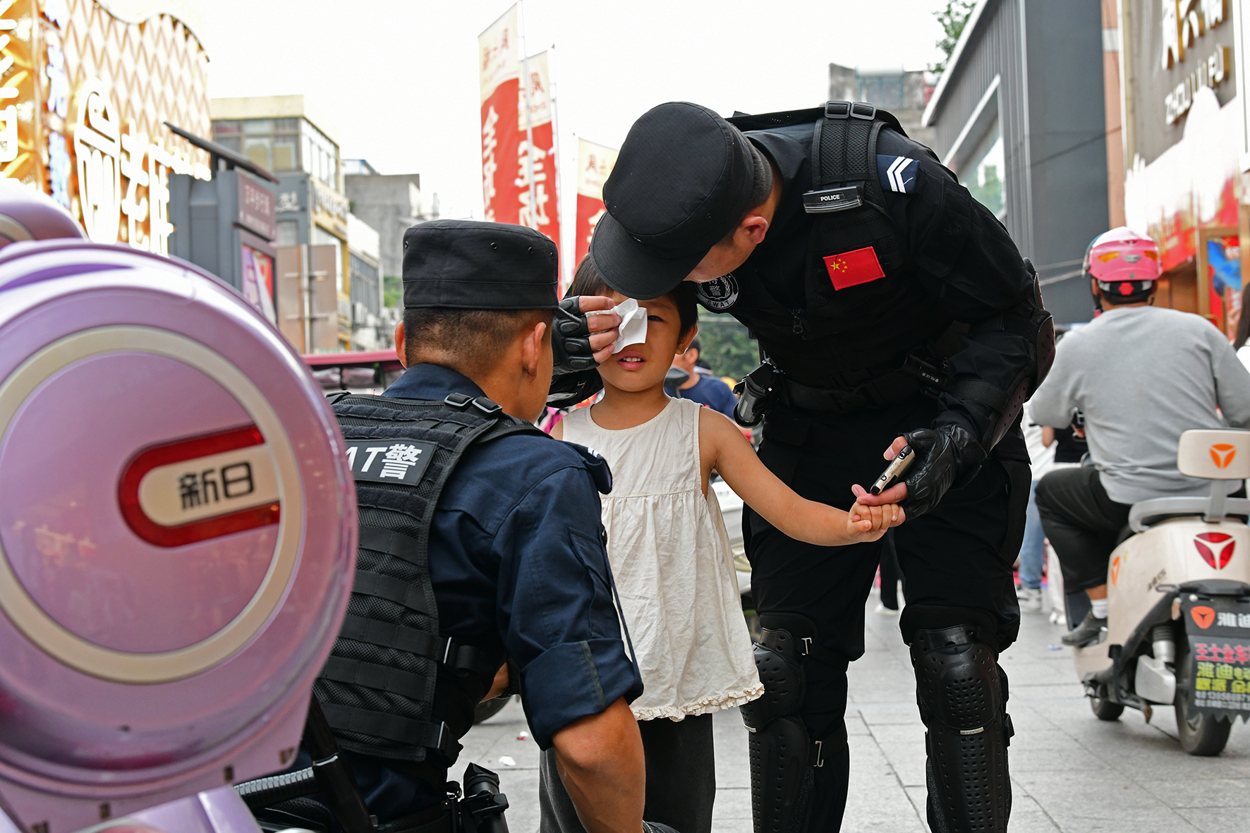 10月1日,安徽省阜南縣巡防大隊民輔警在城區(qū)萬宇商業(yè)街區(qū)巡邏時發(fā)現一名走失幼童。經過半小時的尋找,終于在一地下商場內通過喊話找到了幼童家人。