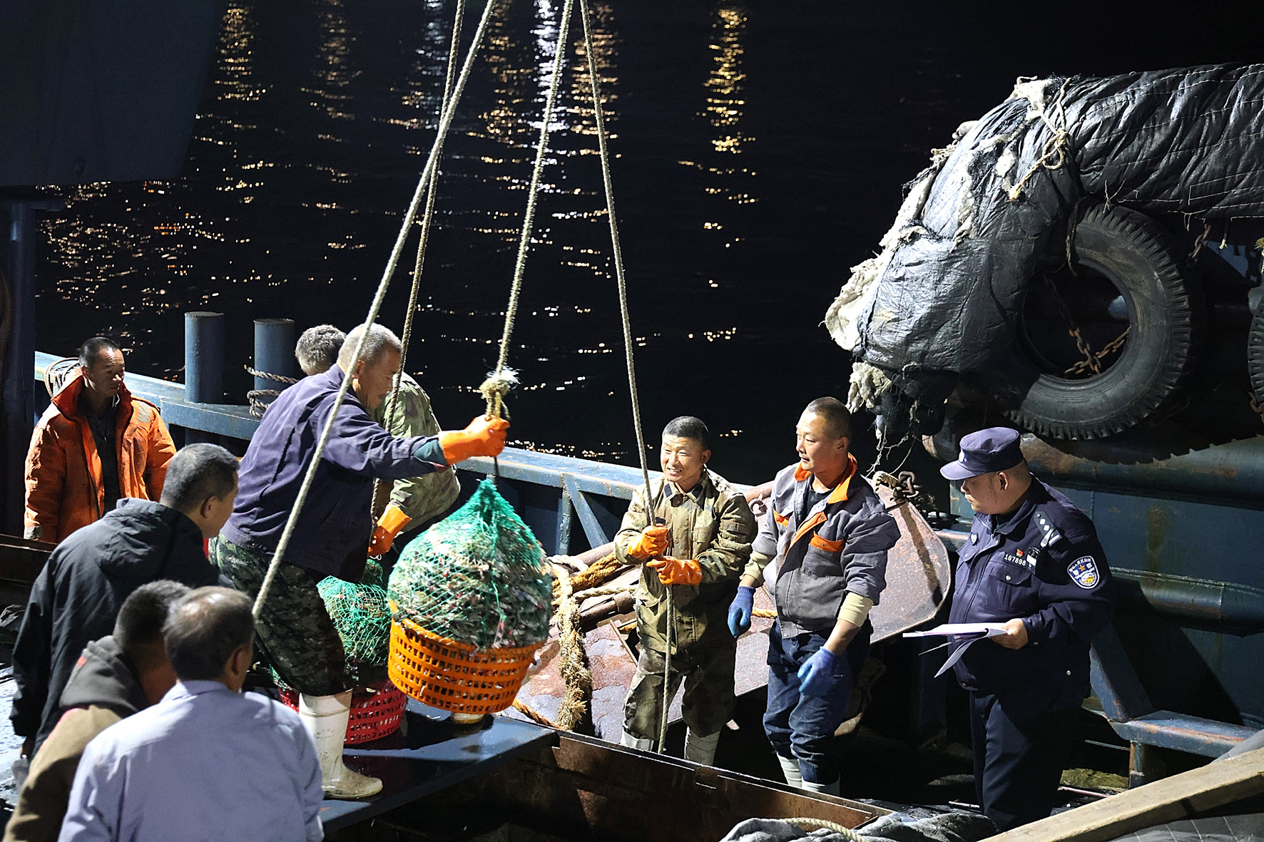 10月6日,遼寧丹東邊境管理支隊新溝邊境派出所民警對漁船出海捕撈的海產品進行報備清點核查。