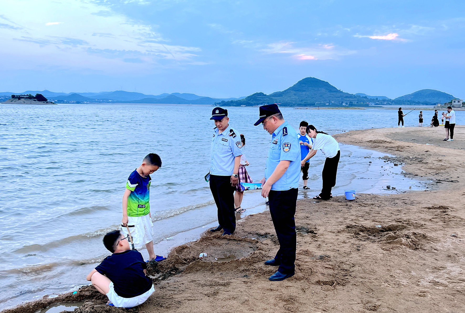 10月5日,山東省棗莊市公安局山亭分局馮卯派出所民輔警在巖馬湖畔開展巡邏防控,提醒小朋友注意安全。