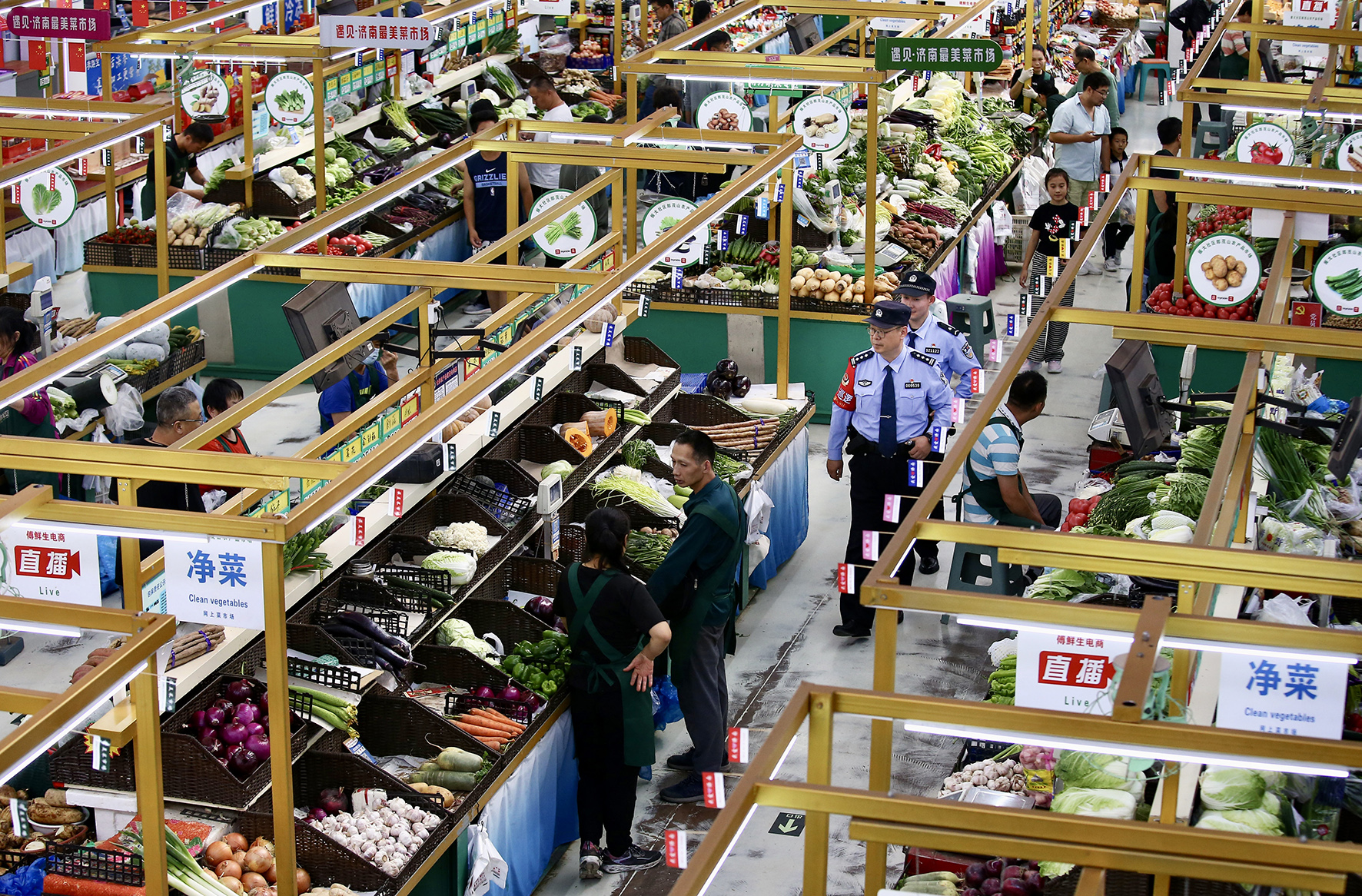 10月1日,山東省濟南市公安局市中區(qū)分局七里山派出所民警在郎茂山農產品市場巡邏。