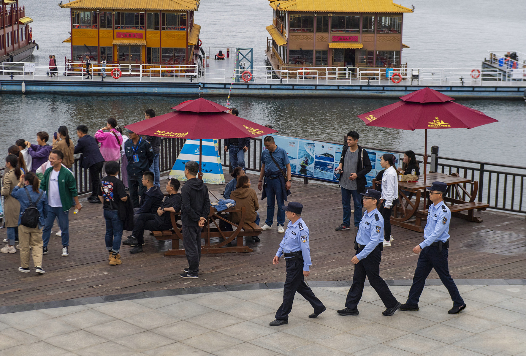10月4日,安徽省舒城縣公安局旅游警察大隊民警在風景秀麗的萬佛湖風景區(qū)內巡邏守護、為游客提供幫助。