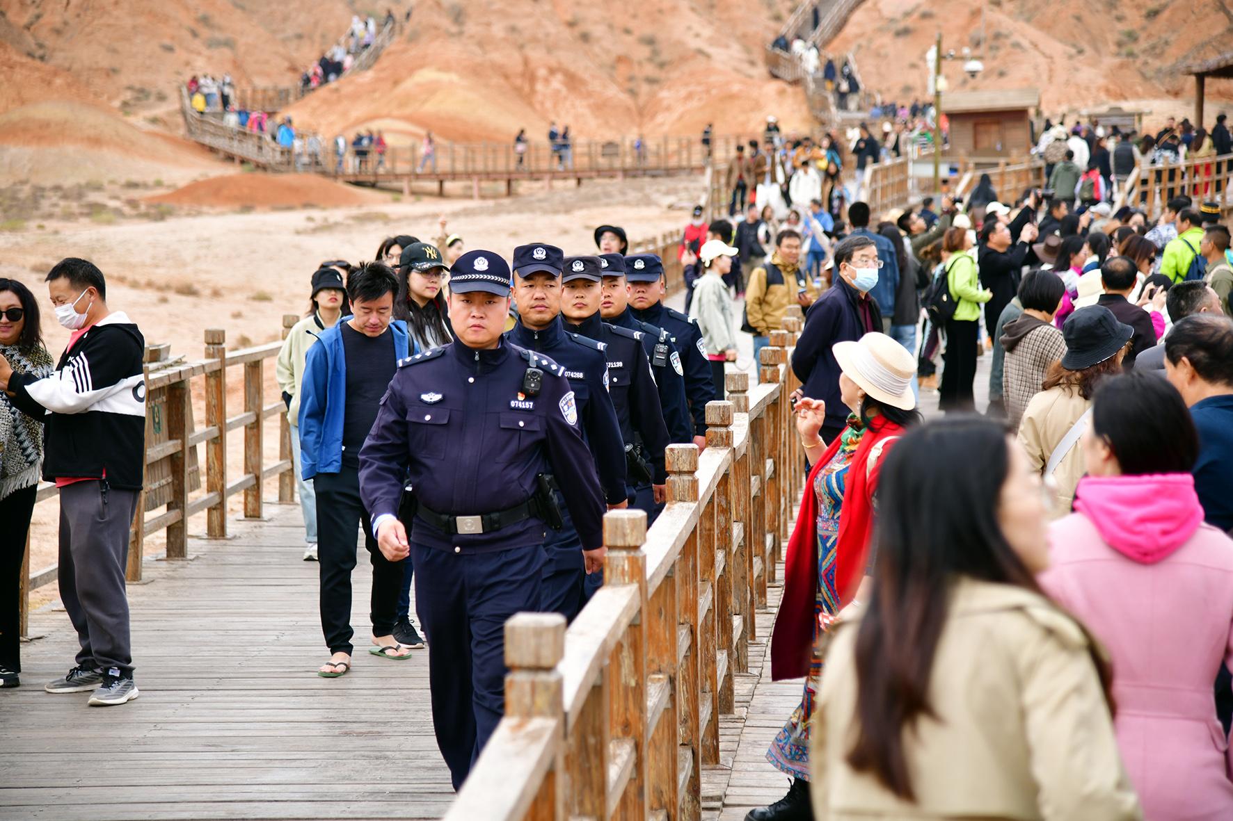 10月5日,甘肅省張掖市臨澤縣公安局丹霞景區(qū)派出所民警輔警加大景區(qū)內執(zhí)勤巡邏力度,全力守護景區(qū)游客安全。