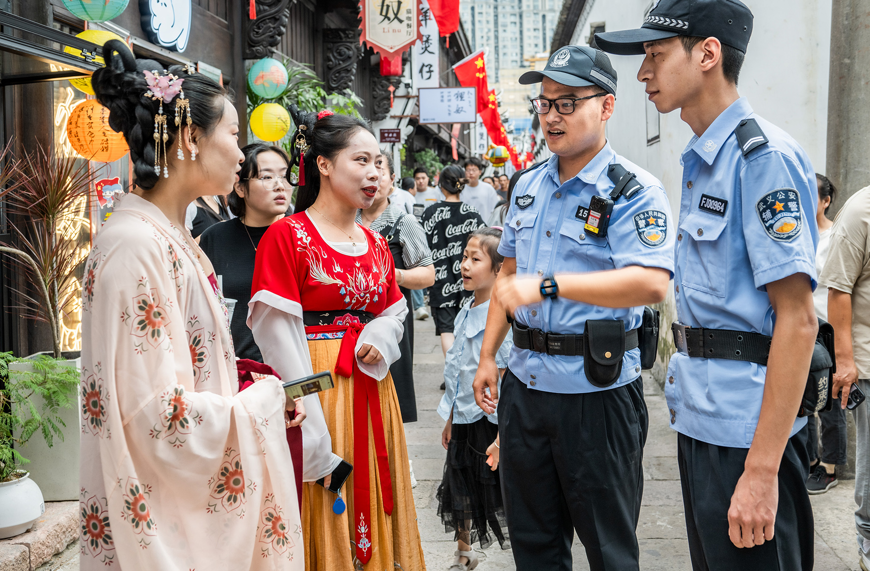 10月1日,浙江省武義縣公安局壺山派出所民警在人員密集的縣城古街進行治安巡邏。